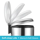 Dual Trash Can, 2 x 4 Gal Garbage Can, 2 Compartments, Steel Pedal, Plastic Inner Buckets and Soft-Close Lid, Round Stainless Steel Hands-Free Kitchen Recycle Bin Silent Close Lid: The soft-close lid ensures the environment remains peaceful, the design of internal hinge prevents the lid from bumping the wall. No loud slamming to be heard. Neat Kitchen Environment: The stainless steel material resists fingerprints and the spread of dirty things without dulling the natural sheen and luster of the steel. Bottom seal, enjoy a cleaner environment. Strong Steel Pedal: This kitchen trash can with strong steel pedal. It’s hard to open the lid of a rubbish bin with your hands when you are busy in the kitchen. The pedal-type garbage can solves this problem well, letting you have your hands free to tuck away your waste. Standing Function: While the manual cover opening angle is greater than 90 degrees, it's convenient for kitchen use or peeling. (Note: The cover cannot be opened for a long time when the foot is less than 90 degrees, and it can be opened and closed when the foot is pressed.) Dual Compartments Trash Can & Bucket in Bin: Double inner barrel design, dry and wet classification, recyclable and non-recyclable classification. The inner bucket has a storage hole. Put on the garbage bag(minimum 45cm opening, height 60cm) and roll the bag mouth to make it more stable.