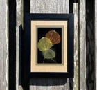 This is an original hand-etched Leaf Line Shadow Box created by artist Booker Morey in 1997. The small glass artwork features a nature theme with leaves in a 3D collage style, framed and signed by the artist. It measures 6 inches in length, 8 inches in height, and 1 inch in width. The piece is one of a kind and includes a Certificate of Authenticity. Made in California, USA, using mixed media techniques.
