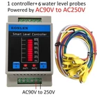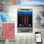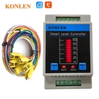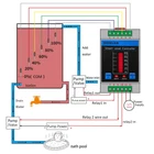 It is a KONLEN WIFI intelligent water level controller, which can be set by Tuya smart or Smart life App to realize water level monitoring, water supplement or drainage, high and low water level remote APP push alarm notification, built-in buzzer or external siren local alarm, inquiry history record etc. The product is suitable for various water level control occasions, such as HVAC system, hot water process, municipal drainage, boiler, water tower, storage tank, breeding irrigation etc. Both controller LEDs and App can display 6 water levels: 0%, 20%, 40%, 60%, 80%, 100% Water level rising: water level < 20% electrode; App display 0%; reach to 20%, App display 20%; reach to 40%, App display 40%; reach to 60%, App display 60%;reach to 80%, App display 80%, reach to 100%, App display 100%. Water level reducing: Water level below 100%, App display 75%; below 75%, App show 50%; below 50%, App display 25%, below 25%, App display 0%. A: WIFI configuration button Manual switch of relay output 1 B: Manual switch of relay output 2 The manual switch is only effective when the current water level is between the preset start and stop-water level value. C: WIFI configuration indicator / Relay output 1 status indicator D: Relay output 2 status indicator E: Display current water level F: Built-in buzzer for high low water level local alarm. Terminal 1: 100% water level Terminal 2: 80% water level Terminal 3: 60% water level Terminal 4: 40% water level Terminal 5: 20% water level Terminal 6: 0% water level, Common Terminal ( COM ) Terminal 7,8: Relay Output 1 (Normal Open) Terminal 9,10: Relay Output 2 (Normal Open) Terminal 11,12: w orking power input : Two versions, Version 1: AC90V to AC250V, Version 2: DC5V App main function and features: 1. Both App and six leds on controller can display current real time water level. 2. Normally relay switch CH1 connects with water pump for adding/draining water control. In app, the No1,4,6, 7,14,15 all for relay switch CH1 control and setting. With the setting, users can realize water level control with four working modes: add water, drain water and Time-limited adding / draining water. 3. In app, the No.2, 5, 8, 9 are for relay switch CH2 control and setting. CH2 has 4 function options (Manual, Alarm, L_On, H_Off, L_Off, H_On, so it is supplementary function options of CH1. Choose the option" Alarm ", user can connect siren or flash light for local alarm of low high water level. Choose option " Low level_On, Hight level_Off " or " Low level_Off, Hight level_On ", then water level can also control relay CH2 On/off. It can realize the second water pump to add or drain water. It can also connect heater for anti dry boiling protection. When water is lower than preset level, stop heater heating. 4. No.17 main switch is for emergency setting . When the water pump or water probe appear malfunction, users can set it Off to disable both two relays temporarily. Although two relays are disconnected, but the water level can still display normally. Wiring Connection Examples: Note:The feature of relay CH1/CH2 are just like a common power switch, no voltage output. The wiring connection is same as a normal switch's Example 1 : Relay CH1 connects with water pump for adding water. When water level display 0% ( < 20%), start to add water. When water level reach to 100%, stop to add water. Relay CH2 connects with heater for anti-dry boiling protection When water level ≥25%, turn on heater to heat water. When water level display 0% ( < 20%), turn off heater to prevent from dry boiling. App Setting CH1: work mode : add, level on1: 0%, level on 2: 100% App setting CH2: CH2 function: L_Off, H_On ( Low water level, relay CH2 Off; High water level, relay CH2 On ) Level On2: 25%, Level Off2: 0% Example 2 : Relay CH1 connects with water pump for draining water. When water level reach to 100%, start to drain water. When water level ≤ 20% , stop to drain water. Relay CH2 connects with siren or flash light for high low water level alarm or warning. When water level ≤ 20%, make low level alarm, When water ≥80%, make high level alarm. App Setting Set CH1: work mode: Drain, Level on1: 100%, Level Off1: 20% Set CH2: CH2 function: Alarm No.10 Low level alarm: 20% No.11 High level alarm: 80% No.12 Remote alarm: High & Low When water level rises to be preset high level or reduces to be the preset low level, App push alarm notification. At same time, relay CH2 connects. Siren is activated to make alarm immediately. Example 3: Relay CH1 for adding water, CH2 for draining water Relay CH1 connects with first water pump for adding water. Relay CH2 connects with second water pump for draining water. It is widely applied to public baths and other related places. Set CH1 Work mode: Add The preset "water level on 1" < " water level off 1" It is "Add water" mode. Set CH2: CH2 function: L_Off, H_On (Low water level, relay CH2 Off; High water level, relay CH2 On ). The preset"water level on 2 > “water level off 2". It can realize water draining. Relay CH1 Control Mode 1: Add water Water level ≤ start up level, relay output 1 connects, start to add water. Water level ≥ preset" stop level", relay output 1 disconnect, stop to add water; Relay CH1 Control Mode 2: Draining water Water level ≥ preset "start up level", relay ouput 1 connects, start to drain water. Water level ≤ preset " stop level", relay output 1 disconnects, stop to drain water; Relay CH1 control Mode 3: Time-limited adding water Water level ≤ start up level, relay output 1 connects, starts to add water, at same time, starts the timer. Relay 1 will auto disconnect when it reaches to the preset limited running time, stop adding water. Relay CH1 control Mode 4: Time-limited draining Water level ≥ start up level, relay ouput 1 connects, start to drain water, at same time, starts the timer. Relay 1 will auto disconnect when it reaches to the preset limited running time, stop draining water. High & Low water level alert Can set t