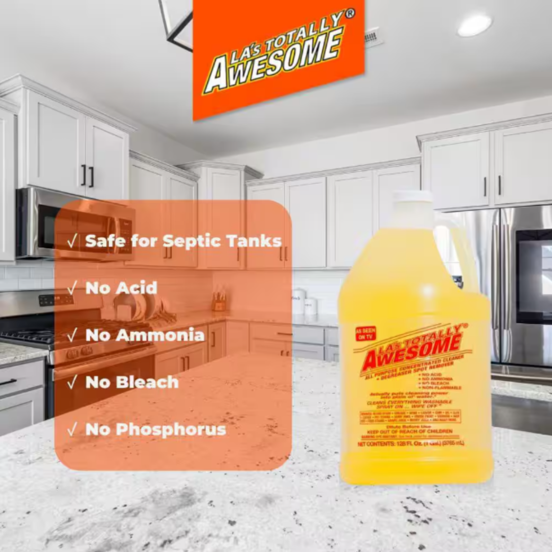 LA's Totally Awesome 1 Gal. All-Purpose Cleaner Concentrate (4-Pack) WE SHIP WITHIN 3-10 DAYS FROM USA We don’t ship items to PO box addresses, warehouse Free Shipping – Free Returns – Money Back Guarantee If you have any problem with the product, PLEASE contact me directly via eBay message, Please do not open a dispute because we cannot help if you open a dispute. Thank you very much! LA's Totally Awesome 1 Gal. All-Purpose Cleaner Concentrate (4-Pack) About This Product A unique blend of proprietary ingredients works between the spot and the surface to harmlessly remove even the most stubborn of stains from any washable surface. Dilute the concentrated formula for the solution to almost any household cleaning need. Non-toxic and biodegradable, nothing gets the job done like LAs Totally Awesome. Awesome makes use of superior wetting agents to get deep down to the stain. Awesome uses complex Floro-surfactants to reduce the surface tension between the surface to be cleaned and the product. The emulsifiers then take over and form a bond with the stains and lifting them off, thus making it easy to clean those hard to clean stains. Imagine taking out a stain from the carpet and see another stain appear in the same spot a couple of days later. This happens when products don't contain anti soiling agents. Awesome is manufactured with a proprietary blend of Floro-surfactants and Encapsulated Polymers to give the best spot removal and anti-soiling characteristics to any surface to be cleaned. Highlights Cleans everything washable Spray on wipe off Dilute before use No acid No ammonia No bleach Non-toxic Biodegradable Product Information Internet # 319287613 Model # 100539308 COMBO2 Dimensions Product Size 4 GA-Gallon Details Concentrated or Ready to Use Concentrated Disinfectant Non Disinfectant Features No Additional Features Formulation Professional Strength Helps Remove Blood, Coffee, Grease, Hair Products/ Make-Up, Ink/ Markers, Oil, Paint, Red Wine Pack Size 4 Product Form Liquid Recommended Surfaces Specialty Returnable 90-Day Scent Citrus Where to Use Specialty