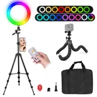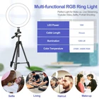 Emart 10-inch 11 Colors & 10 Brightness Levels RGB Selfie Ring Light with Adjustable Tripod Stand & Cell Phone Holder, Dimmable LED O Ring Light for Live Stream, YouTube Video, Makeup. 【MULTI-FUNCTION MODE RING LIGHT】The 10inch rgb ring light includes more than three original lights of white light, warm light and natural light, It also in 13 RGB colors, you can switch between 16 colors (Giving you unlimited creative space), not only that, dimmable rgb ring light also has 9 brightness adjustments and 13 dynamic modes. Whether it is a party, concert, or family dinner, it can be perfectly adapted. 【USB PLUG】Devices that support any USB port, such as laptops, PCs, mobile power supplies, USB chargers, AC adapters, etc. There are four buttons above the switch, including the selfie light switch, brightness levels adjustment, dynamic mode adjustment. It is easy to find your preferred options in seconds. 【MULTIPLE USES】Ring light with stand kit has multiple compatibility. Youtube video recording, photography shooting, makeup live streaming, Facebook Live, and barber. O light ring will meet your demand in multiple environments. Desktop ring light with stand can be put in a portable carrying bag, it can be carried with you wherever you go, convenient and durable. 【MULTIPLE TRIPODS OPTIONS FOR MORE POSSIBILITY】Extendable tripods from 16.3 inches to 53.7 inches, combined with 180°neck rotation & 360°head rotation to find your best & beautiful shooting angle. And another octopus style tripod stand allows Multi-angle shots on an Uneven Surface, or wrap it on a pole, tree etc. To capture various views from different angles. Giving a greater possibility of wider applications indoor or outdoor. 【MORE ACCESSORIES】Universal pole mount phone holder compatible with almost all smartphones, 360 degree rotatable, adjustable viewing whether it may be horizontal, vertical, or any angle under the sun. Also includes Bluetooth, allowing long-range use. Compatible with iOS and Android cell phone. Wireless remote shutter can adjust RGB color, brightness.