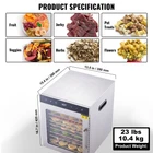 Features & Details 10-Layer Stainless Steel Trays: This food dehydrator has ten stainless steel trays that are food-grade 304 and measure 11.8 x 11 inches / 300 x 280 mm each. Each layer can hold up to 1.7 pounds of food, so you can dry different types of fruits and vegetables all at once. Adjustable Timer & Temp: This food dehydrator has a control panel which lets you choose the most optimal time and temperature for your ingredients. You can set the time between 0.5-48 hours, and the temperature can be adjusted between 86-194°F / 30-90°C. Specially Selected Material: Our jerky dehydrator machine is made of durable, corrosion-resistant 201 stainless steel. The tray is high-quality 304 stainless steel, BPA-free, and safe to wash in the dishwasher. The machine also features a built-in LED light and large viewing window, so you can easily keeo an eye on your food as it dries. 360° Hot Air Circulation System: The beef jerky dehydrator machine has a rear-mounted drying fan, 800W of drying power, and 360° air circulation technology, which helps to dry your food evenly. The machine does this without spinning and locks in the original flavor of your favorite foods. Beyond Your Imagination: Prepare 100% all-natural dehydrated foods and snacks, no more processed junk food! This stainless steel dehydrator is perfect for making jerky, dried fruits, fruit leather, yogurt, vegetables, nuts, and even bread. The package includes silicone roll sheets, sieves, gloves, and paper recipes, allowing you to get creative and make whatever you like! Say hello to a healthier way to live! On Oct 17, 2024 at 20:06:27 PDT, seller added the following information: