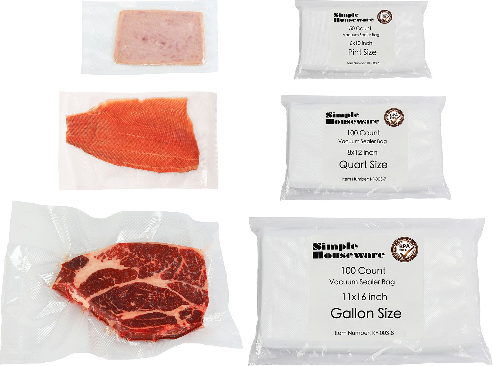 Precut Vacuum Sealer Bags 100 Count Gallon 11" x 16" for Food Storage, BPA Free Safety: BPA Free, Simmer and Microwave Safe, Great for Sous Vide Cooking One for All: Designed for use with all vacuum packaging machines Heavy Duty: Commercial grade multi-ply material block oxygen and moisture and eliminates freezer burn and dehydration Better Value: Pre-made bags take less time to use and more convenient.