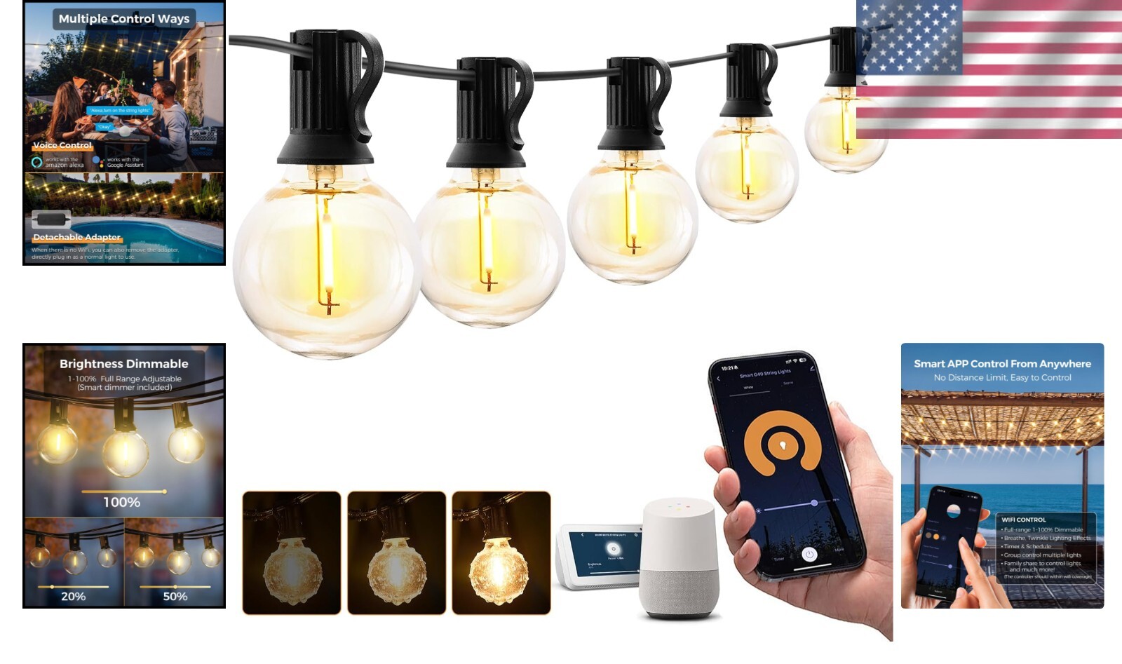 Outdoor String Lights 100Ft G40 LED Warm White Dimmable WiFi App Alexa Waterproof ‹ › ‹ › ‹ › ‹ › ‹ › ‹ › ‹ › ‹ › ‹ › ‹ › ‹ › Outdoor String Lights - 100Ft G40 LED Warm White Dimmable WiFi App & Alexa Compatible Features: Smart App Control: Effortlessly manage your outdoor patio lights anytime, anywhere with the XMcosy App. Customize brightness, create blinking patterns, and schedule automatic on/off times to suit your routine. Voice Control: Free your hands with seamless integration with Alexa and Google Assistant. Enjoy convenient voice commands to control your lighting. No WiFi? Enjoy it directly with a simple plug-in. Dimmable LED String Lights: Adjust the ambiance with the included smart dimmer, offering brightness control from 1% to 100%. Customize breathing and flashing effects directly from your smartphone. Waterproof and Durable: listed, our commercial-grade string lights are built to withstand all weather conditions, perfect for outdoor settings such as porches, pergolas, gazebos, backyards, bistros, pools, decks, and fences. Connectable Lights: The 100ft G40 globe string lights come with 34 shatterproof, energy-saving LED bulbs (plus 3 spares). Effortlessly connect up to 100 bulbs to illuminate your special events like weddings and parties. Benefits: Create the perfect atmosphere for any occasion. Customize brightness levels to match your mood. Weather-resistant design ensures longevity. Energy-efficient lighting helps save on energy costs. Connect multiple lights for extensive coverage. Easy to set up and control via app or voice. Why choose our Outdoor String Lights? Transform your outdoor spaces into a stunning oasis with our 100Ft G40 LED Warm White Outdoor String Lights. Offering smart control features like dimming, timers, and voice commands through Alexa or Google Assistant, these lights exhibit both elegance and convenience. Built for any weather with shatterproof bulbs, our string lights are designed to create unforgettable atmospheres for gatherings, holidays, or everyday enjoyment. Don't settle for ordinary lighting; elevate your ambiance with our luxurious outdoor string lights. Order yours today and let your next gathering shine! Shipping Free & Fast Shipping - We offer free shipping to most of the USA with a normal delivery time of 3-7 days. However, due to the current situation, additional delivery time (up to 3 weeks) may be required for some items. Alternative Carriers - We may use alternative carriers (e.g. USPS, FedEx, UPS, etc.) to ensure your package arrives safely and on time. Due to the use of multiple carriers, we are unable to provide a tracking number automatically. Handling Time - Orders are processed and shipped within 1-2 business days of receiving cleared payment. Shipping Restrictions - Shipping to Alaska, Hawaii, Puerto Rico, Guam, and other US territories may incur shipping charges or delivery restrictions. Please contact us before ordering, or your order can be refunded/cancelled. State Restrictions - There may be restrictions based on your state of purchase. For example, certain items may not be shipped to California due to state regulations. Contact for Tracking Updates - If you require tracking updates or have any concerns about the delivery of your order, please feel free to contact us, and we will be happy to assist you. Return 30-Day Hassle-Free Returns - We want you to be completely satisfied with your purchase. If you are not, you can return the item within 30 days of receiving it for a full refund or exchange. Easy Return Process - To start a return, simply contact us and we will provide you with a prepaid return shipping label and detailed instructions. Restocking Fee - There are no restocking fees for returns. However, the buyer is responsible for return shipping costs if the return is not due to a seller's error. Refund Processing Time - Refunds will be processed within 5 business days of receiving the returned item in its condition. Payment We accept all major credit cards, PayPal, and Apple Pay for your convenience. Your payment information is secure and encrypted to ensure a safe and seamless transaction. Please complete your payment within 3 days of purchase to avoid any delays in shipping. Feedback Your feedback is extremely important to us. We strive to provide the best products and customer service possible. If you are satisfied with your purchase, please take a moment to leave us a positive review. If you have any concerns or issues with your order, please contact us before leaving negative feedback. We are committed to resolving any problems and ensuring your satisfaction. Contact Us If you have any questions or concerns, please feel free to out to our customer support team. You can contact us through the eBay messaging system. We are available Monday to Friday, 9:00 am to 5:00 pm EST, and we will do our best to respond to your inquiry within 24 hours. Buy it now and enjoy a pleasant shopping experience! Size: 100ft Lumens: Not specified Power Consumption: Not specified Unit Quantity: 50 Features: Dimmable,Waterproof,Smart App Control,Voice Control,Connectable,Energy Efficient,Timer,Shatterproof Light Color: Warm White,White-2700K Occasion: Anniversary,Birthday,Christmas,Housewarming,New Control Style: App Control,Voice Department: Unisex Baby & Toddler,Kids,Teens,Adults Room: Porch,Outdoor,Indoor,Patio,Gazebo,Deck,Backyard,Bistro,Pool,Fence Material: Plastic,LED Type: String Lights Lighting Technology: LED Light Shape: Globe Sensor Type: Not applicable Installation Area: Outdoor Color: White Power Source: Corded Cord Color: Not specified Number of Settings: Not specified LED String/Strip Type: G40 LED Chip Code: Not specified Voltage: Not specified Output Voltage: Not specified Amperage: Not specified Style: Modern Number of Lights: 50 Color Temperature: 2700K Bulb Life Hours: Not specified Unit Type: Unit