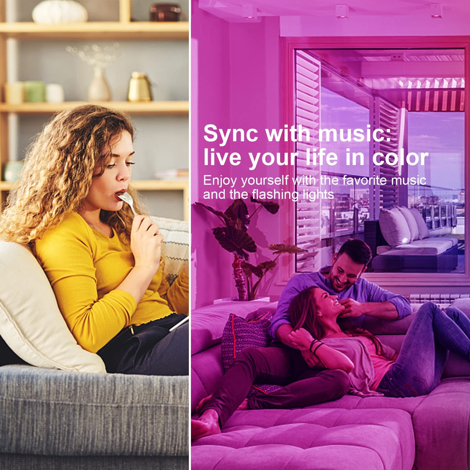 Smart WiFi LED Strip Lights - The strip light can freely control colors through Bluetooth remote control or smartphone APP, you will have a lot of fun playing music from the light control app, makes your living room alive at night, it adds personality to your family. 100ft Long Strip Lighting - Two rolls of 50ft strip light are long enough to decorating your room and available to be cut to your desired length along the cutting marks. It is also very easy to install and control with the strong adhesives and remote. Music Sync - The built-in highly sensitive mic makes the light strip can dance to the music tempo, changing color sync with the rhythm of sound, which can ignite the ambience especially of a party or when you indulge in the computer game playing. DIY for Different Scenes - Via the app, there are so many colors and multiple scene modes for you to choose from to apply to wherever like bedrooms, living rooms, kitchens, parties, weddings, Christmas, Halloween, etc. (This led light is not waterproof, please don’t apply it to outdoor.) SMART Timer Function - Via the smart App, our RGB LED strip lights allow you to preset on & off times. The led lights perfect for use before sleep or automatically switching a special awakening surprise.