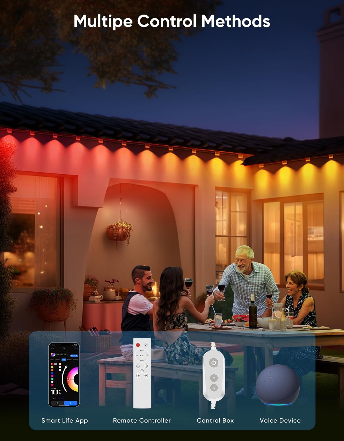 Festive RGBICW Lights: Choose from 111 scene modes to light up Halloween and Christmas with the permanent outdoor lights, a signature DIY light for every occasion Multi-function Independent RGBW Lighting Effects: The permanent outdoor lights combine RGB, warm white, and cool white LEDs, offering 16 million colors and an adjustable color temperature range. Ideal for decorating gardens, patios, or any outdoor area, they will bring beautiful brilliance to your space. Smart Lighting Experience: These permanent outdoor lights support not only app control but also come with an infrared remote (AAA batteries not included). Customize settings via the smart app, including scheduling, color adjustment, and scene switching, to create unique outdoor holiday decorations or accent lighting. 110+ Scene Modes & Voice Control: Featuring over 110 different scene modes, you can individually assign colors to each bulb or use presets to match various outdoor scenarios. Compatible with Alexa and Google Assistant, simply speak your activity or mood for instant perfect lighting. Built to Last Outdoors: The light strings and controller are designed for long-term use with an IP65 waterproof rating and a lifespan of up to 50,000 hours. Withstanding harsh weather conditions from -4°F to 140°F (-20°C to 60°C), they ensure year-round brilliance for your outdoor lighting. Captivating Lighting Effects: The 4-in-1 RGB+WW lens design offers a wide beam angle up to 105° and wall washing depth up to 16 inches. Recommended installation distance is 2-4 inches from the wall. With a color temperature range of 2700K-6500K, it's suitable for daily lighting and creating personal ambiance. The string lights support color changing and adjustable brightness. Important Notes:1.Total string length must not exceed 100 feet; cutting is prohibited. 2.Works only with 2.4GHz Wi-Fi; 5GHz Wi-Fi is not supported. 3.Multiple sets cannot be physically connected (use group control instead). 4.24/7 online support available for further assistance.