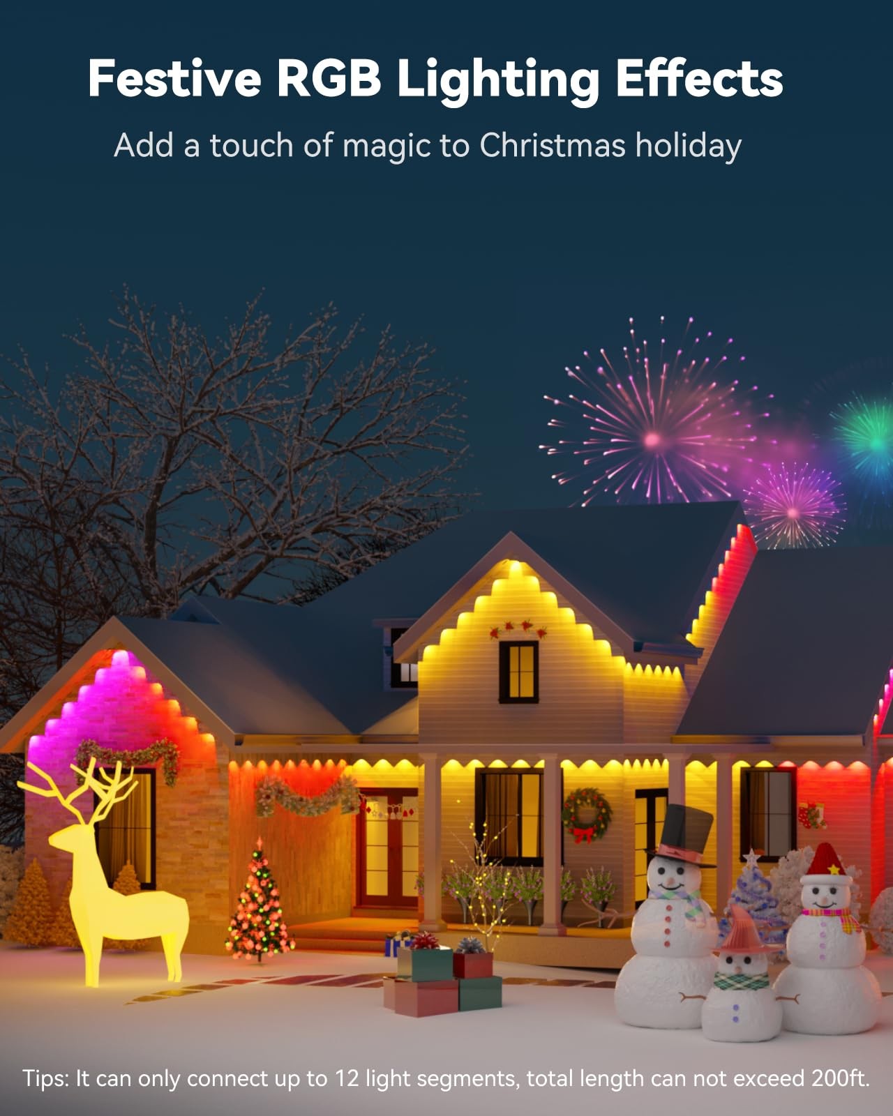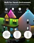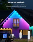 Feature: Permanent Outdoor Lights for House, 100ft with 60 RGBCW LED Smart Eave Lights, 3600lm Super Bright, IP67 Waterproof, 100 Scenes Modes for Halloween Christmas Party Daily Lighting, Smart APP/Voice/Control Box/Remote Control, White How to Connect to Smart Life app? Preparation: Download Smart Life app. Before installation, connect each string light firstly and the plug it into power to make sure the lights normally working. Your phone has connected 2.4GHz WiFi instead of 5G WiFi. Connection: 1. Turn on the bluetooth of your phone and your phone has connected 2.4GHz WiFi. 2. Your phone should be close to the control box within 5m at the first connection. 3. The lights plug in the power supply, the multi-color lights will keep flashing and the blue indicator of control box will keep blinking. (If the blue indicator of control box is steady instead of blinking, please long press ON/OFF button of control box for about 5 seconds to RESET device.) 4. Go into Smart Life app, click "add device"--discover device--tap the device icon to connect. 5. Finally you could control the permanent outdoor lights via the app. 6. Click "..." at the right corner of device app interface --click " Light number setting" --click " Refresh", finally the whole strand will both light up. Package list: 16.4ft black string light * 6 Power supply * 1 Control Box * 1 Remote Controller(No AAA Battery Included) * 1 6ft extension cords * 2 Adhesive * 6 Screw clips * 30 Screw packs * 8 Ruler * 1 User Manual * 1 【Upgraded RGB Festive Lighting】Extendable to maximum length 200ft. Newest Upgraded Smart APP, provides 100 Scene Modes, 16 million colors, Real 10 music modes, DIY and timer function, meets all your home’s exterior lighting needs for Independence Day/Flag Day/Father's Day/Halloween/Party etc. ( For 10 real music modes, you can also adjust the Mic sensitivity to reach real-time lighting effects with the change of music rhythm.) 【Improved Warm and Cool White Lighting 】Real 5 in 1 RGB+WW+CW LED Beads, with 5-channel-LED chip in each unit, provide dedicated adjustable cool white+ warm white for daily and accent lighting, with adjustable color temperature from 2700K-6500K, and 60lm per light(4000K white lights) . 【Cuttable and Extendable】Freedom to DIY . You can cut and splice the lights following the user manual's instructions. Note that the total length should not exceed 200ft----Updated on August 20. ( 100FT version comes without the waterproof wire connector:B0D9W3RP7M, and 100ft version does not include the T-splitter(B0DHXJTVCK), both available in our store.) 【Smart APP/Remote /Control Box/Voice Control】Individually control the color of each led light via Smart Life app; Pair with Alexa, Goggle Assistant for smart voice control; easily control via the remote get multiple functions; Also directly change the color for the whole strand, adjust brightness, RESET, ON/OFF via the control box, no need to connect to app. 【Built for Outdoor Harsh Environment】Featuring anti-UV material, these year-round permanent outdoor lights can be used for up to 50,000 hours and work in weather from -4°F to 113°F (-20°C-45°C). and the led lights, power adapter and control box are all IP67 waterproof. (other brand's control box are IP65) 【Easy to Install】Disconnect the power, clean the surface with a tissue. Use the provided VHB gum sticker and clips to install each outdoor light in 8 seconds. Splice through waterproof joints every 16.4ft and install them on eaves. Install the lights 2-4 inches away from wall surface. Note: test whether the lights normally work before installing.[Please begin all installation and connection steps after power off to avoid damage]