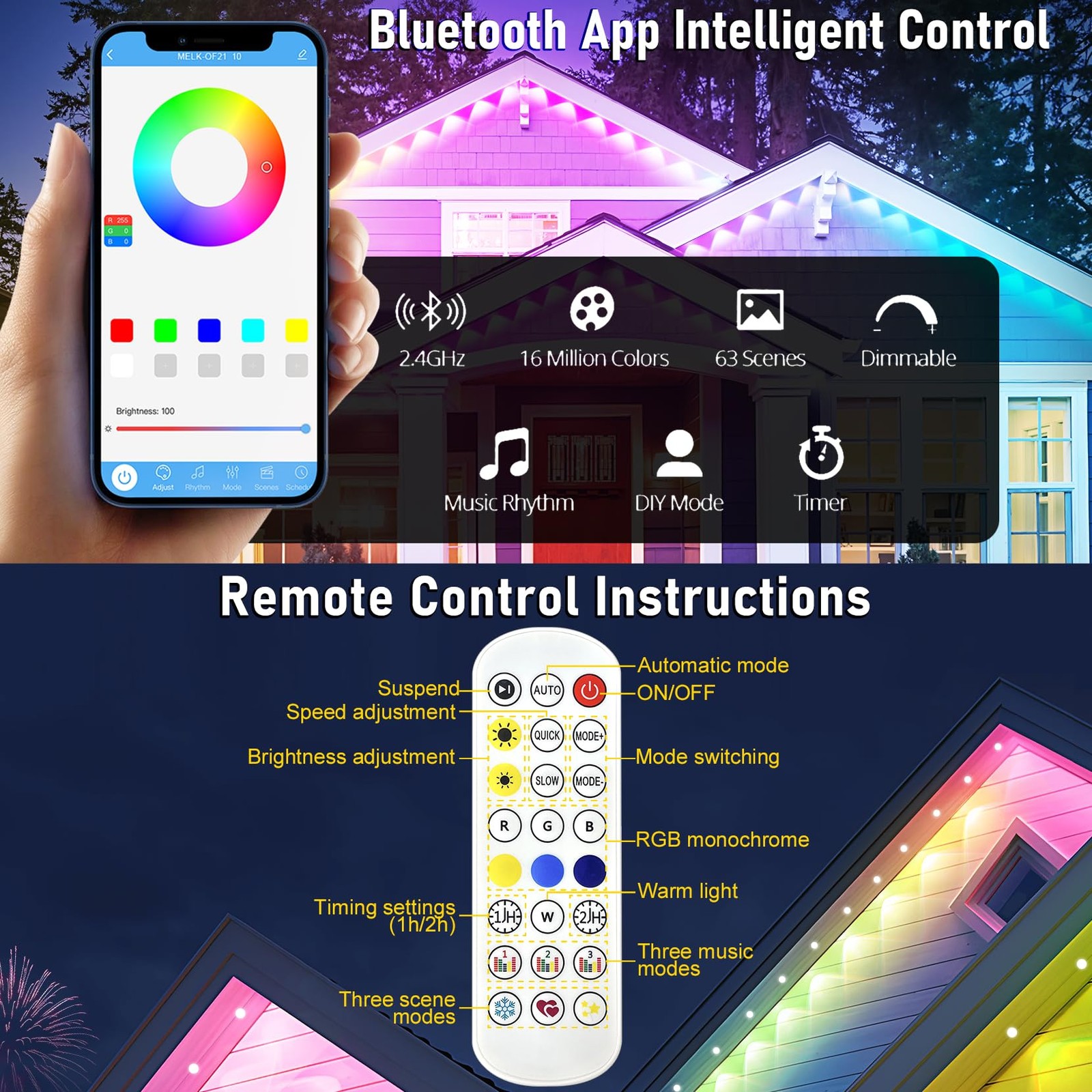 Permanent Outdoor Lights,100ft RGB+IC Eaves Lights with App Control Remote Weather Resistant Design: Elevate your outdoor decor with RGB eaves lights outdoor! These permanent outdoor lights feature IP67 waterproof LED bulbs that can survives in all seasons and they are perfect for any weather conditions such as rainy days, snowny days, and sunny days. Note: the power adater is not waterproof. Colorful and Versatile: Immerse yourself in a world of colors with these RGB +IC lights that can be controlled via remote or APP (Connection model name: MELK-OF21 10). Sync the lights with music and set them on a timer. More functions are available on the App or remote control: sync the lights with music, set the lights timer to automaically turn on/off with the App, change lights colors from 16 million colors, set scenes. Easy Installation: Say goodbye to complicated setups with these eaves string light set! Each LED light bulb comes with adhesive backing for quick attachment. Package includes all necessary accessories for a hassle-free installation process. Versatile Occasions: These outdoor eaves string lights are perfect for birthdays, pool parties, campfires, holiday celebrations, and more. Create a festive atmosphere for Christmas, New Year's, Halloween, or enhance commercial events with our color changing outdoor string lights. Energy-Efficient Lighting: Illuminate your outdoor space with our LED Christmas lights! These smart outdoor lights are bright, energy-efficient, and waterproof, ideal for construction sites or outdoor events. Add color and style with our versatile color changing outdoor string lights.