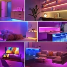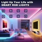The LED Strip Lights, Smart LED Strips 100ft are multicolor tape lights designed for indoor use in a bedroom. They have more than 6 settings and can be controlled via remote control or app. These energy-efficient lights feature music sync and color-changing capabilities, making them ideal for parties or creating a cozy ambiance in a new home.