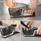 104N Professional Knife & Scissors Sharpener is a perfect sharpener for those who own both standard European/American style knives and Santoku & other Asian style knives of double beveled edge. Stage 1 uses preset crossed carbide blades to put a quick edge on knives. Stage 2 uses ceramic blades to hone the fine edge. This sharpener can also be used for serrated blades. Only use stage 2 for serrations. The special shaped tungsten carbide blade is designed for scissors sharpening. The heavy duty, ergonomic handle with the rubber over-molded grip provides a stable and comfortable platform for sharpening all your knives, scissors. Versatile & Professional – This 5-stage sharpener is the ultimate tool for sharpening both kitchen knives and scissors. It not only restores dull or damaged blades quickly but also hones them to a razor-sharp edge.