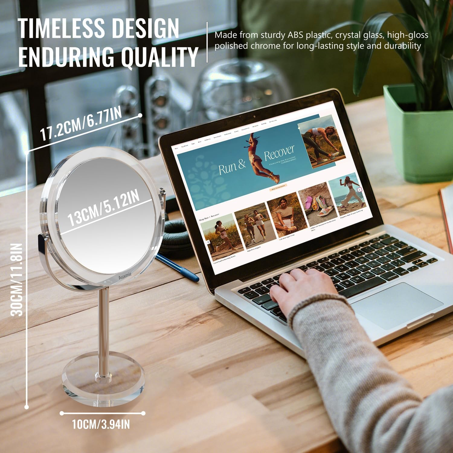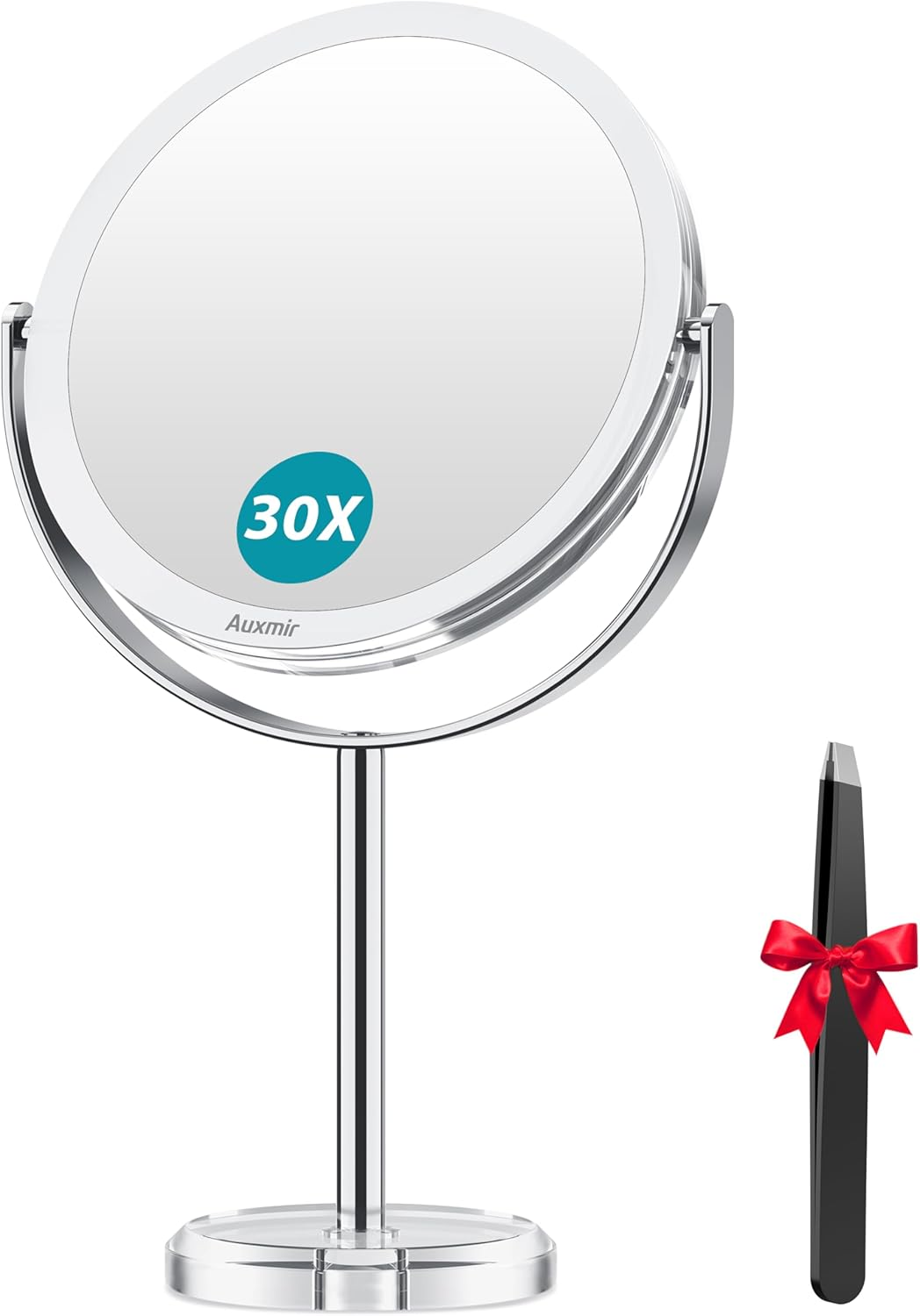 30X/1X DOUBLE-SIDED MAGNIFYING MIRROR: From the 30X magnifying side, it clearly reflects every detail on your face that you might miss on normal makeup mirrors. Achieve a natural look using the 1X HD side and utilize the 30X magnification for precise makeup applications, eyebrow tweezing, facial care, shaving, and more WARM TIP for 30X MAGNIFICATION: When you use the 30X magnifying mirror side, please get your face close (WITHIN 4 IN) to the makeup mirror in order to see clearly and avoid blurriness or upside down. It is not a product defect, but rather a natural physical occurrence in concave mirrors 360° ROTATION: This makeup mirror can rotate 360°, so it's easy to adjust for the best view. Our tabletop mirror gives a clear reflection from all sides and can be switched smoothly between 1X and 30X magnification PORTABLE AND DETACHABLE MIRROR: The tabletop makeup mirror is detachable and can be easily assembled. When detached, the parts take up little space so that you can easily store them into your suitcase or backpack when traveling DURABLE & ELEGANT: The makeup mirror consists of HD mirror, stainless steel and ABS plastic, which makes it durable and easy to clean. Along with the clear look and glossy finish, it is extremely elegant and can easily fit in different scenes like bedroom, bathroom, living room or office PERFECT GIFT & EXCELLENT SERVICE: Auxmir two sided makeup mirror with magnification is a perfect gift for friend, family or lover. Auxmir provides 7/24 customer services and 36-month warranty. If you have any inquiries, please don't hesitate to reach out to us Product Description 1 TIMELESS & ENDURABLE 2 MULTI-LAYER 3 CHROME-POLISHED STAND 4 STABLE BASE 1 LIGHTWEIGHT & DETACHABLE 2 EASY INSTALLATION 1 1X/30X DOUBLE SIDED 2 360° ROTATION 1 BATHROOM 2 BEDROOM 3 HOME & OFFICE