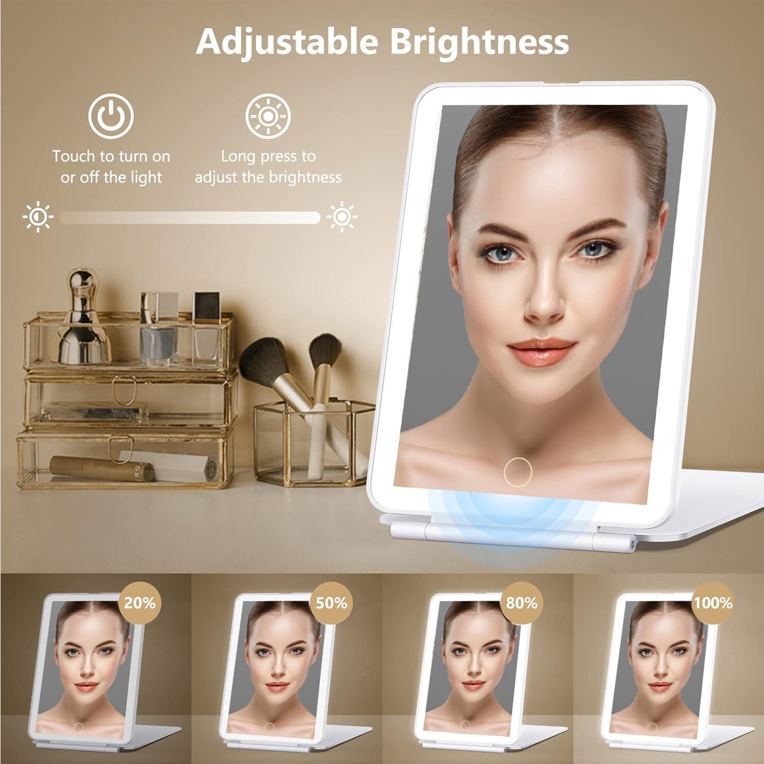 Makeup Mirror,Vanity Mirror with Lights, 10X Magnification, Folding Lighted Rechargeable Travel Makeup Mirror,Lighted Makeup Mirror,Makeup Mirror with 72 Led Lights, Women Gift (White) Product Details Brand: Tyseoome Room Type: Bathroom Shape: Star Product Dimensions: 1"L x 1"W Frame Material: Plastic Brand: Tyseoome Room Type: Bathroom Shape: Star Product Dimensions: 1"L x 1"W Frame Material: Plastic Mounting Type: Tabletop Mount Finish Type: Plain Special Feature: Lighted, Touch Screen, Rechargeable Battery Color: White Theme: Travel Specific Uses For Product: Personal Grooming, Travel Number of Pieces: 1, 2 Number of Items: 1 Material: Plastic Frame Type: Framed Assembly Required: No Frame Color: White Manufacturer: Tyseoome Size: 1"L x 1"W Item Weight: 13.1 ounces Country of Origin: China Item model number: 1 Date First Available: April 21, 2024 Suitable for more scenarios-It is suitable for Commute,car travel, hotel, university, office, gift and home. The overall size is 25.5 x 19 cm (10 x 7.5")", and the folded thickness is 2 cm (0.8"). Perfect gift for wife, friends, mother and yourself.It perfect for makeup, shaving, brushing your teeth, exfoliating and more. Its like IPAD size, which fits well in a bag. You can take it everywhere. We've thought of everything for you. Simple operation-The cosmetic mirror is made of high-quality ABS and glass material,see your facial features, without any magnification and distortion and no dizzy,which is more durable than normal plastic mirrors.The mirror can be self-standing. Short press to switch on and long press to adjust the brightness. Theres color temperature memory light function. Multi-Function Touch Screen -This vanity mirror features a high-sensitivity touch button design.Therere 72 LED lights. It comes with 3 color lighting modes: white, natural and warm white . You can select a desired color to avoid embarrassing situation for makeup. The makeup mirror comes with a light brightness control by the touch sensor switch. USB rechargeable portable-This foldable rechargeable mirror with lights is 5*7.5IN 261g,just a ultra-thin Ipad Mini Size.Built-in 1800mAh battery, connect a laptop, charger or mobile power supply via Micro USB for charging, no worry about replacing batteries.The lightweight, ultra thin and foldable, you can easily put it in your backpack and suitcase, fitting for home, travel or working use. Gift for Women-It's a ideal gift for your lover.Top gift for women,birthday gift, Valentine's Day gift, Mothers Day gifts, Christmas gifts for teen girls, family, wife, or girlfriend, or another special day gift; If you're not satisfied with your order, please contact with us, we promise to return your hard-earned money. makeup mirror
