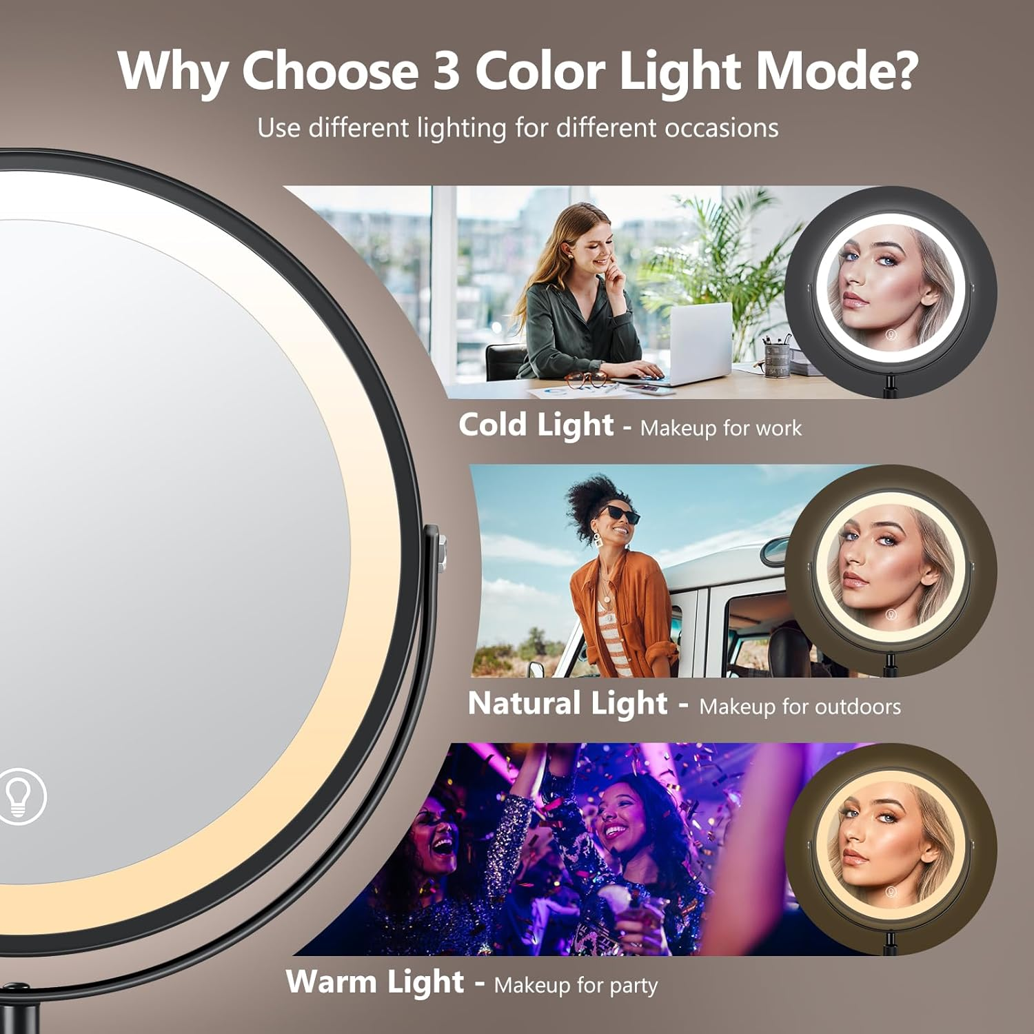 8" Lagre double sided mirror, classic 1X /10X double sided mirror design, 1X mirror for regular makeup, 10X magnifying mirror for detailed makeup. 10X magnification is used for applying lipstick, threading eyebrows, putting in contact lenses, facials or applying mascara, etc. Warm Tips: When using a 10x magnifying mirror, please keep a distance of 6 inches to avoid dizziness 3 Color light modes & stepless brightness, the makeup mirror design has 3 lighting color modes: white light, warm light, and cold light, the soft lighting can cover all corners of the face. Short press the sensor switch to change the color of the light, long press to adjust the brightness of the light, meeting all your needs in different environments Built-in rechargeable 2000mAh battery, it can be used wirelessly for 4 hours after full charge, the light lasts longer, saving the cost of battery replacement, the brightness is 30% higher than other power supply methods. Which can be available at any time through charging by a laptop, mobile power supply, or charger Height adjustable makeup mirror, height from 14.9-18.9in adjustable, you can find the comfortable height you need, conforms to any height of the makeup table, it is an ideal choice for family, travel, and hotel use. 360° rotation design, switching between 1x and 10x Magnifying mirrors, allowing you to easily find the desired angle Perfect gift for women, this is a Christmas gift, Valentine's Day gift, Mother's Day gift, or birthday gift for girls, family, wives, or girlfriends. Your satisfaction is our principle of service, if you have any questions about the product, please don't hesitate to contact us Product Description