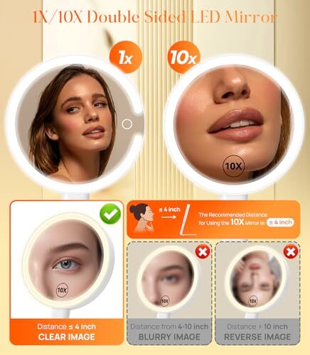 Return Policy Fast Delivery Trusted seller Magnifying Travel Mirror with Light 10X 1X Magnifition 2-Sided Lighted Makeup Mirror Rechargeable 3 in 1 Hand Held Desk Hanging LED Mirror with 3 Color Dimmable Lights, White Product Description 【VERSATILE 3-IN-1 MAKEUP MIRROR】Boasts a flexible foldable handle, this multifunctional lighted hand held mirror offers handheld, tabletop, and hanging options for convenient use at home or on the go 【HD 1X/10X MAGNIFYING 2-SIDES MIRROR】One side of the mirror offers a standard 1x reflection, while the other side provides a 10x magnified view. The 1x mirror is perfect for general makeup application, while the lighted magnifying mirror allows for precise focus on facial details to help achieve flawless results 【3 COLOR MODES & STEPLESS DIMMING】This light up mirror features 3 different light color options: warm, natural, and white. You can easily customize the lighting to suit any environment or occasion. The brightness of the ring light mirror is adjustable to meet your specific preferences. Additionally, it includes a smart memory function that stores the brightness level from your last use, ensuring convenience for your next use and eliminating the need for frequent adjustments 【2000MAH BATTERY & 30 MINS AUTO TURN OFF】Equipped with a built-in 2000mAh rechargeable battery, this mirror can be used continuously for 3-12 hours when fully charged. The convenient type-C rechargeable design frees you from the hassle of battery replacement. To save energy, the lights will automatically turn off after 30 minutes of inactivity. (Charger not included) 【LIGHTWEIGHT & PORTABLE TRAVEL COMPANION】This travel mirror with light weighs just 1.03 pound and includes a detachable base and a velvet storage bag. Whether you're on the go, at a party, or traveling for business, this versatile mirror is the ideal choice for you 【BEST GIFT & 100% SATISFACTION GUARANTEE】This beautiful mirror makes a wonderful gift for Christmas, Birthdays, Anniversaries, Mother's Day and Valentine's Day. Our customer service team is always available to assist you with any issues you may have with your cosmetic mirror. Please feel free to reach out to us at any time and we will get back to you within 12 hours Shipping Returns Payment Shipping Shipping is FREE to all addresses other than APO/PO boxes in the lower 48 states. All our stock ships from US-based warehouses. Shipped via USPS or UPS (depending on location and package weight) Unless stated otherwise, all orders will ship within 24-72 hours of your payment being processed. Check our feedback to see the great reviews of FAST shipping we offer. Returns Seller does not accept returns Payment We currently accept payment via eBay managed payments only. Once payment is cleared, we will dispatch your shipment within 1-3 business days. Please refer to the "Shipping" tab for more information regarding shipping speed to your destination.