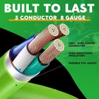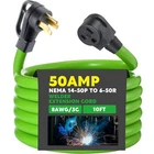 Features: Application: This welder adapter cord allows for a secure connection, allows you to simply convert the power with RV or generator socket to fit for your welder. High electrical rating: Our cord are not only safe in use but also provide optimal power transfer for your welding work. Specifications: Material: PVC Color: green Size: about 10 ft in total length Package includes: 1 x Welder extension cord Notes: Manual measurement, please allow slight errors on size. The color may exist a slight difference due to different screen displays. Welder Generator Extension Cord: 10 ft generator to welder power extension cord; Connect 14-50P plug to generator outlet and connect 6-50R receptacle to welder plug, helps you connect welder to generator or RV Converter; Support max 50 amp overload, 250V, max wattage 12500 watts; Nice solution to convert generator machine to run the welder 14-50P Male Plug: this is a 4 prong male plug that designed to be compatible with NEMA 14-50P outlets and has a capacity of 50 Amp; Crafted from PVC and copper, the welder generator extension cord boasts of durability; It is most frequently utilized with RV campgrounds, generator power sockets, and home dryer wall sockets; Handle on plug and receptacle ends, making it easy to plug in and unplug 6-50R Female Connector: it is a female connector compatible with NEMA 6-50R and has a capacity of 50 amps; 3 prong 6-50R receptacle for welder with handle, designed for easy grip, plug or unplug without damaging the cord, making it safer to use; Also suitable for dryers, recreational vehicles, electric vehicles, dishwashers and so on Cable Built to Last: this 50 amp 4 prong generator to 3 prong welder cord boasts a molded plug, copper wiring coating, flame retardant and UV resistant materials to ensure the durability, and the 3 conductor 8 AWG construction, plus an indoor or outdoor waterproof jacket, can effectively avoid surface oxidation, making it an ideal choice for outdoor usage Enhanced Safety with Easy to Find Design: our 50 amp generator to welder extension cord is well designed in the green color, bright and noticeable, so you don't have to worry about searching for your charging equipment in the dark, helping to reduce the risk of accidents in dimly lit spaces like garages, gardens and more, allowing you to stay safe and enjoy peace of mind during the charging process