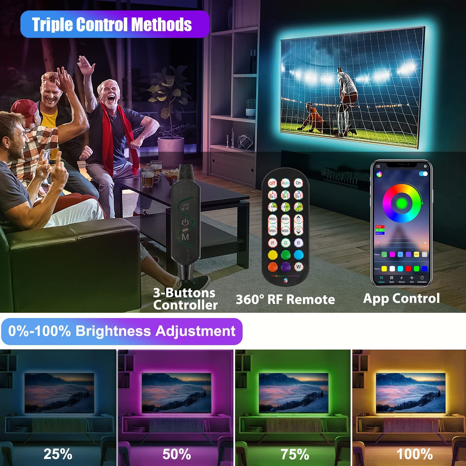 9.8ft (6x1.64ft) USB LED Strip Lights creates a home theatre-like enjoyment by adding colored light behind TV/ PC. Feature£º * 9.8ft USB LED Strip Lights is designed for 43-65Inch TVs. Multiple bright colors make TV pictures and movies more vivid. * Triple Control Ways: "duoCo Strip" App, 24 Keys RF Remote and 3-Buttons Controller. * Multi-color RGB LED Strips: 16 million static colors and 28 dynamic lighting modes can be chosen. * Music & Mic Mode: App control led light strip has a smart Music Mode, built-in sensitivity adjustable microphone, lights color will change with the the rhythm of the sound and music. * Timer Setting: You can use the app to set the timing on/off, it makes this USB strip light into an "alarm clock". * USB Powered LED Strips: USB interface design, that will bring more convenience. Working voltage is 5V, extremely low heat. You can easily work with any USB devices like TV, computer. * Multi Applications: TV backlight, TV monitor, PC screen, Accent lighting, Kitchen lighting, led undercabinet light, Mirror back lighting. Specification: Working Voltage: USB DC5V Length: 9.8ft/3m Colors: 5050 RGB Power: 10watt (max ) Waterproof: Non-Waterproof Low power consumption: Super bright LED, saving up to 85% energy and 50,000 hours long life. Package List: 6 x 1.64ft Black USB LED light strip with 3 Buttons controller 5 x Connecting Cable How to connect the led strip lights? APP name is " duoCo Strip ", please search for and install the application in Google play or Apple store or via the QR code on the manual/controller. Android 4.3 or IOS 8.0 or later edition required,no limit for mobile phone configuration. Step1: Please download ¡° duoCo Strip¡± APP. Step2: Please make sure your phone is Bluetooth enabled. Step3: Then strip lights automatically connect to the APP. LED Strip Lights: 10ft LED strip lights with 6 pre-cut 1.64ft RGB LED lights for TV backlighting and more Reduce Eye Strain: LED backlighting helps reduce eye strain and prevent headaches while watching TV or using a computer Triple Control Ways: LED lights can be controlled via the 'duoCo Strip' app, RF remote, and 3-button controller for customizable lighting Music Sync Lighting: LED strip lights sync to music beats and change color and mode with the rhythm of the sound Safety and Easy Installation: LED strip lights are USB powered, touchable, and safe for children. They come with self-adhesive tape for easy installation on any dry, flat surface