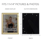 Displaying personal photos and mementos adds warmth and give your home a unique personality. Add some sparkle with our gold, silver, champagne or rose gold photo frames. Constructed of a high-quality MDF with a lustrous finish, these frames will enhance any decor in your home or office. Choose a single or bundle pack from the Celebration Collection. Size options include popular 4x6 and 5x7 snapshot sizes, and 8x10 and 11x14 for larger photos. All frames include attached hardware for wall mounting, either horizontally or vertically. The 4x6, 5x7, 8x10, and 11x14 comes with an adjustable kickstand fin on the back, to set on a tabletop, desk, or shelf. Get mixed sizes to create a photo gallery grouping in a hallway or along a staircase, or set the frames on a photo ledge, accent table, or piano top. Showcase those special events in your life by filling the frames with awards and certificates, souvenirs such as ticket stubs, programs, postcards, and children's artwork. This set of Celebration frames is a thoughtful gift for any special occasion or person including a wedding, anniversary, Christmas, best friend's birthday, grandma, Mother's Day, Valentine's Day, baby shower, family collage, or Father's Day. Check out the family of distinguished frame collections (subject to availability): Celebration Lumina Richland Kensington Crestwood Prima Seaside Prosperity Tranquility BRING ON THE GLAMOUR - This high-style brushed metallic finish frame will add beauty to any style décor with an over 1 inch PS molding that curves outwardly from the inner bevel accent INCLUDES - 3 Gold frames, fits standard 11 by 14 pictures or prints with an opening that reveals a 10.5 x 13.5 inch image; High-definition, heat-strengthened glass for clarity and damage resistance WALL MOUNT or TABLE TOP - Includes D-ring hooks and swivel tabs to easily hang artwork or photographs in either portrait or landscape orientation; Versatile kickstand easel lets you display either horizontally or vertically with a luxurious velvet backing MULTIPLE PACK SIZES AVAILABLE - The Celebration Collection by sells in a variety of pack sizes: set of 1, set of 3, and set of 6 packs are available BUY WITH CONFIDENCE - offers hundreds of fabulous picture frames; Visit our Storefront or search on Frames today !