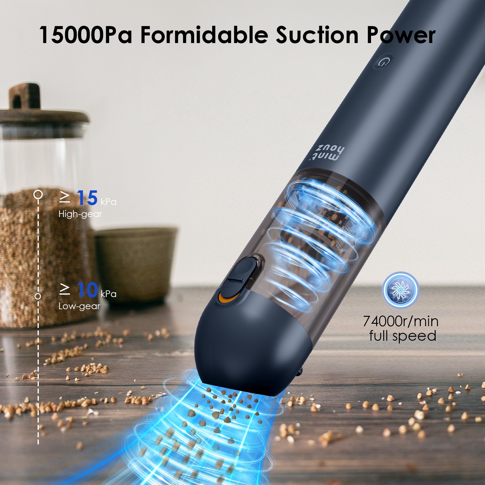 This Car vacuum cleaner original price: $39.99 Only 8 units left, Clearance sale! Limited quantity. Minthouz Mini Handheld Cordless Vacuum Cleaner for Car & Home with 15000Pa Powerful Suction The Minthouz multifunctional handheld cordless vacuum cleaner has 15000Pa strong suction power and is a versatile and powerful cleaning tool that can help you keep your car or home clean and tidy. Its cordless design, powerful motor, multiple attachments, and long-lasting battery make it suitable for multiple cleaning tasks, like removing pet hair, dust, or food crumbs. With a simple and stylish design, the Minthouz portable vacuum cleaner is an ideal choice for home and car cleaning and can be charged at any time. Powerful Motor: The car vacuum cleaner has a high-quality 120W motor, which delivers continuous powerful suction at full speed of up to 74000r/min to meet all of your cleaning needs. Fast Charging: This portable handheld vacuum uses the latest fast charge technology, which can be fully charged in about 3.5 hours. Recommended to use a charger with an output voltage of 5V/2A or larger. Easy to Empty: A one-click buckle allows for simple trash removal and dust cup cleaning. Just one click, and the cap of the dust cup pops open automatically, so it won't dirty your hands when you empty the trash. How to Clean the Filters? ①Rotate counterclockwise to remove the dust cup; ②Pull out the filter system; ③Detach and wash the stainless steel & HEPA filters; ④Air dry the filters completely before use. Button Description 1 (Vacuum Function): 1. Short press it once --- turn on the vacuum function (low-gear) 2. Short press it again --- turn on the vacuum function (high-gear) 3. Short press it again --- turn off the vacuum function Button Description 2 (LED Function): 1. Long press for 3S --- use the lighting function 2. Short press it again --- switch to the red flashing light (Recommended to remove the dust cup and display it upside down) 3. Short press it again --- close the lighting function Note: Vacuuming and lighting functions cannot be used simultaneously. Specification: Model: MT-L011 Color: Pearl Blue Material: Aluminum & ABS Weight: 1.1 pounds Size: 11.9x 2.2x 2.2 inches Suction: 15000Pa (Max) Noise: <85db Battery: 11.1V*2200mAh (3 batteries) Charging Port: USB-C Power/Voltage: 5V/2A Charging Time: 3.5Hours Operating Time: > 20min(Low -gear); > 12min(High-gear) Features: - Helpful to pick up small pieces. - Dual purpose suction and blow. - Low noise operation and better battery life. - Efficient for cleaning dust from sofa or car crevices. - Portable and suitable for both home and car cleaning. - Eddy current booster brushless motor with high speed suction. - LED lights help you deal with emergencies while driving at night. - Stainless steel and filter, double filtration without cleaning dead angle. Tips: 1. Please fully charge it before using for the first time. 2. The vacuum function cannot be used during charging, and it can be used normally after charging. 3. The vacuum is not waterproof; please do not inhale a large amount of water or liquid to avoid damage. 4. Do not inhale high-temperature substances, such as burning cigarettes or hot ashes, so as not to burn the filter or plastic parts. 5. It is normal for the aluminum shell to heat up during use, and it can be used after a period of time. 6. Do not reinstall or vacuum until the filters are completely dry. 7. Please store it in a cool place when not in use and avoid exposure to the sun. In the Box: 1 x Vacuum Cleaner 1 x Brush Nozzle 1 x Long Flat Nozzle 1 x Inflatable Tube 1 x Type-C Cable 1 x Storage Bag 1 x Quick Start Guide