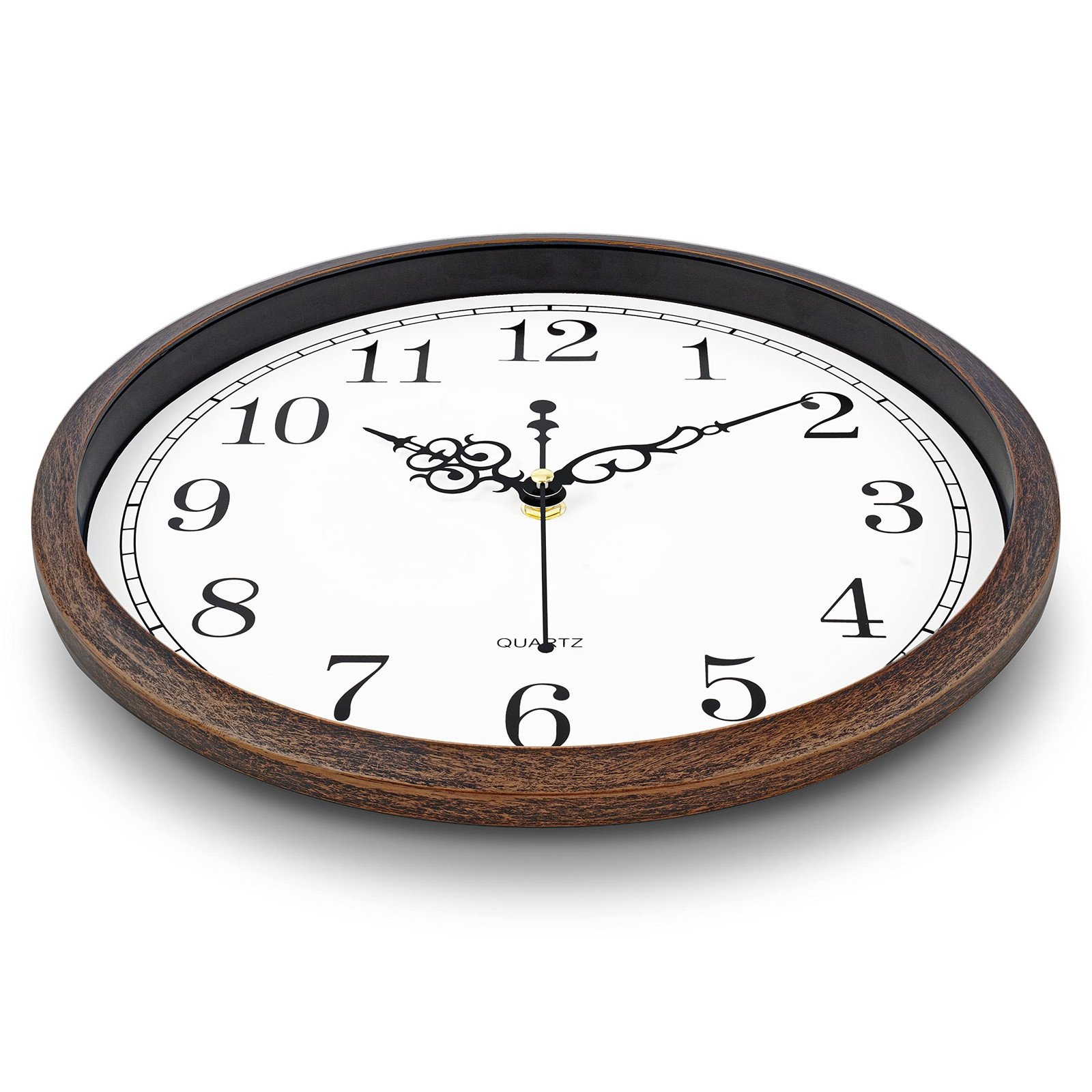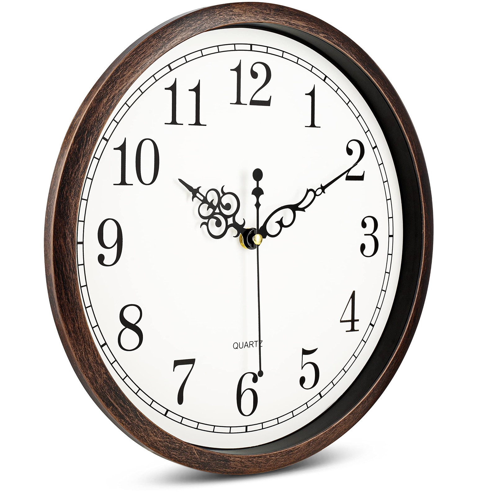 10 inch vintage wall clock. Large black bold numbers and black dial against white face creates easy viewing. Precise quartz movements accurate time Silent non-ticking mechanism with sweeping movement. Enjoy a quiet environment! Sturdy plastic frame and glass lens make it easy to clean and keeps dust away from dial. Rustic brown frame with beautiful texture. Uniquely shaped beautiful hands were crafted to add elegance and style The perfect wall clock for an office, classroom, bedroom, bathroom and any room in your home. Great for vintage, antique, rustic country, and contemporary style décor Easy to Hang. Uses single "AA" battery - not included (Note: Plus side of your battery should be inserted first) 1-year Manufacture included