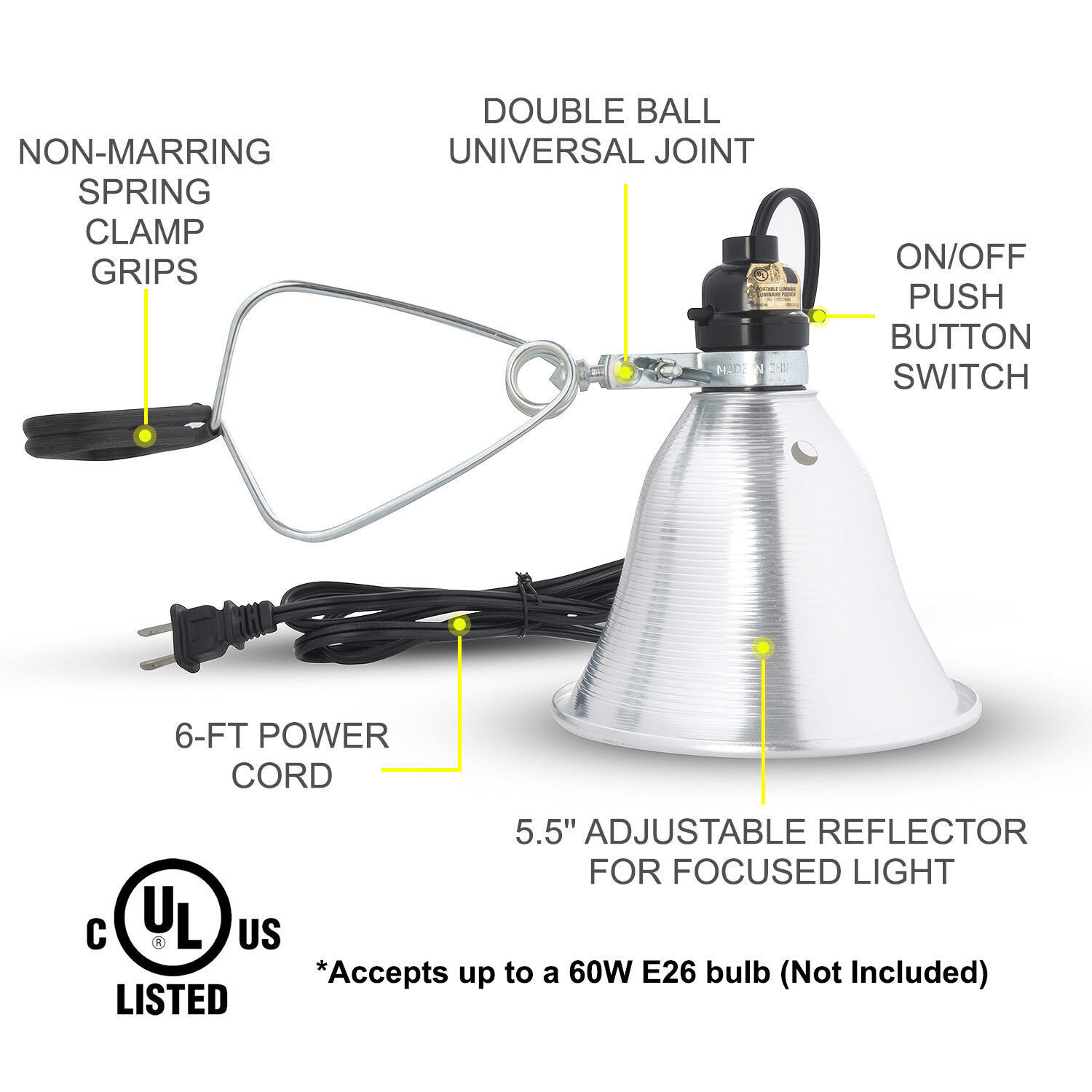 Simple Deluxe Clamp Lamp Light Supply powerful light anywhere you require it with this 5.5" Clamp Light. It is constructed with a scratch-resistant vinyl sleeve and a spring-powered steel clamp with an adjustable ball joint, which allows you to easily position the lamp almost anywhere. The lamp includes an easy to use, energy efficient on/off switch that saves energy. Features On/off push through switch R ated for up to a 60-Watt medium base bulb (E26) Adjustable ball joint for focus light area 6 feet cord and rugged molded-on plug Applications Bed room Aquarium Art studios Product description Simple Deluxe Clamp lights are superior quality products, designed using the very latest technological advancements. The clamp lights have a wide variety of uses and is suitable for many environments. Our clamp light works great for studio, garages, workshops, photo studio, aquarium, art studios and more. Feature & Advantage: MULTIFUNCTION: can be used as a table lamp in your room, garages or art studios, a work light in photography and workshops, amphibians and reptiles pets terrarium heat lamp, and even a growth light for indoor plants PRACTICAL LAMP: having firm clamping grips that do not leave marks on your surfaces, can be used indoors and outdoors ADVANTAGES: 5 .5-inch adjustable aluminum reflector could precisely focus light you need. Non-marring clamp grips for a secure hold. A convenient on/off button with 6 ft long cord SPECIFICATIONS: 5.5X4.25X10 inch, rated for up to a 60-Watt medium base bulb (E26) GUARANTEED: 1 year manufacturer warranty, UL Listed CALIFORNIA WARNING: The power cord on this product contains chemicals, including lead known to the State of California to cause cancer. Wash hands after use. Specification: Size: S Quantity: 12 Pack Volt: 120V Max Watt: 60W Reflector Diameter: 5.5 inch Cord length: 6 feet