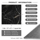 [SIZE] Length: 12 inch; Width: 12 inch [THICKNESS] 0.057 inch [MATERIAL] Vinyl Floor Tiles [COLOR] Black Gold Peel and Stick Floor Tile [STYLE] Marble Peel and Stick Floor Tile [DESIGN CONCEPT] Natural marble look brings timeless charming for your floor! [ADVANTAGES] 1. Marble Peel and Stick Floor Tile Waterproof: peel and stick floor tile, self adhesive floor tiles, no extra glue needed. 2. Marble Peel and Stick Floor Tile Waterproof: removable floor tiles without sticky residue, great temporary flooring for renters. 3. Marble Peel and Stick Floor Tile Waterproof: 12 x 12 peel and stick floor tile, vinyl floor tiles, vinyl laminate flooring, linoleum flooring. 4. Marble Peel and Stick Floor Tile Waterproof: Waterproof flooring, stain resistant, moisture-proof, anti-slip, easy to clean. 5. Marble Peel and Stick Floor Tile Waterproof: This peel and stick tile floor can be used as bathroom floor tile, shower floor tile, kitchen floor tile, it also can stick on bedroom floor tiles, living room floor tiles, this sticky floor tiles are suitable for dinning room, laundry, nursery, dollhouse, playroom, cubicle, farmhouse, garage, basement, attic, kitchenette, gym, dorm, classroom, apartment, office and rv flooring. [PRO TIPS] 1. Measure the size of the floor surface before purchase, buy enough rolls at one time to avoid color difference. 2. Clean the surface before pasting. The adhesion will be the best if the surface is clean, smooth, dry and flat. 3. We recommend to avoid leaving too much water on the floor tiles while cleaning within two days after installation, which helps to maintain great adhesion for a long time. ➤ SIZE & MATERIAL: Each marble floor tile measures 12"x12" and 0.057" thick. 4 tiles per box, totally can cover 4 square feet. The sticky floor tiles are made of superior vinyl, wear resistant and nonflammable, safe for your family. ➤ EASY TO INSTALL: Self adhesive vinyl floor tiles, just peel and stick floor tiles to your room, readjust if you need, cut with utility knife or scissors to fit small space, no grout or special tools needed. ➤ EASY TO CLEAN: This black marble peel and stick floor tile is waterproof and washable, oil proof and stain resistant, easy to clean with a wet mop. ➤ REMOVABLE: Just remove the vinyl flooring tiles if you want. It's perfect removable floor tiles and temporary flooring for renters! ➤ MULTI-USE: Stick on floor tiles to any dry, clean and flat floor, such as for bathroom flooring, kitchen flooring, rv flooring, bedroom, living room, laundry room, dining room, basement, entryway, foyers, gym, garage, office, apartment, classroom, etc. ➤ 24/7 SERVICES: Any questions about peel and stick floor tiles, please feel free to contact us or "Ask a Question". Get the black marble tiles for floor, and start to enjoy your DIY time!