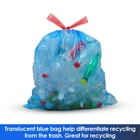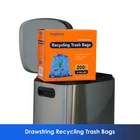 STRONG & DURABLE - Made with durable plastic. No worry about bag breaking. It's strong enough to hold a good amount of recyclable items. FITS 13 GALLON TRASH BIN - Bag size: 2 ft x 2ft 3 3/8 in, it can perfectly fit 13 gallon kitchen trash bins. Keeps everything neat and clean. GREAT FOR RECYCLING - Translucent blue bag can see through and helps differentiate the recycling from the trash. It's great for the regular recycling, like plastic bottles, empty containers, cups, and cans etc. VALUE PACK - It comes 200 recycling trash bags in a dispenser box. Cost-effective and affordable for weekly use. EASY TO USE - All bags are interleaved on roll, no need to tear them off. It is easy to close the bag with the sturdy red drawstring. BAG IS NOT RECYCLABLE - This bag is designed for municipal use. Please check your local facilities to confirm acceptance.