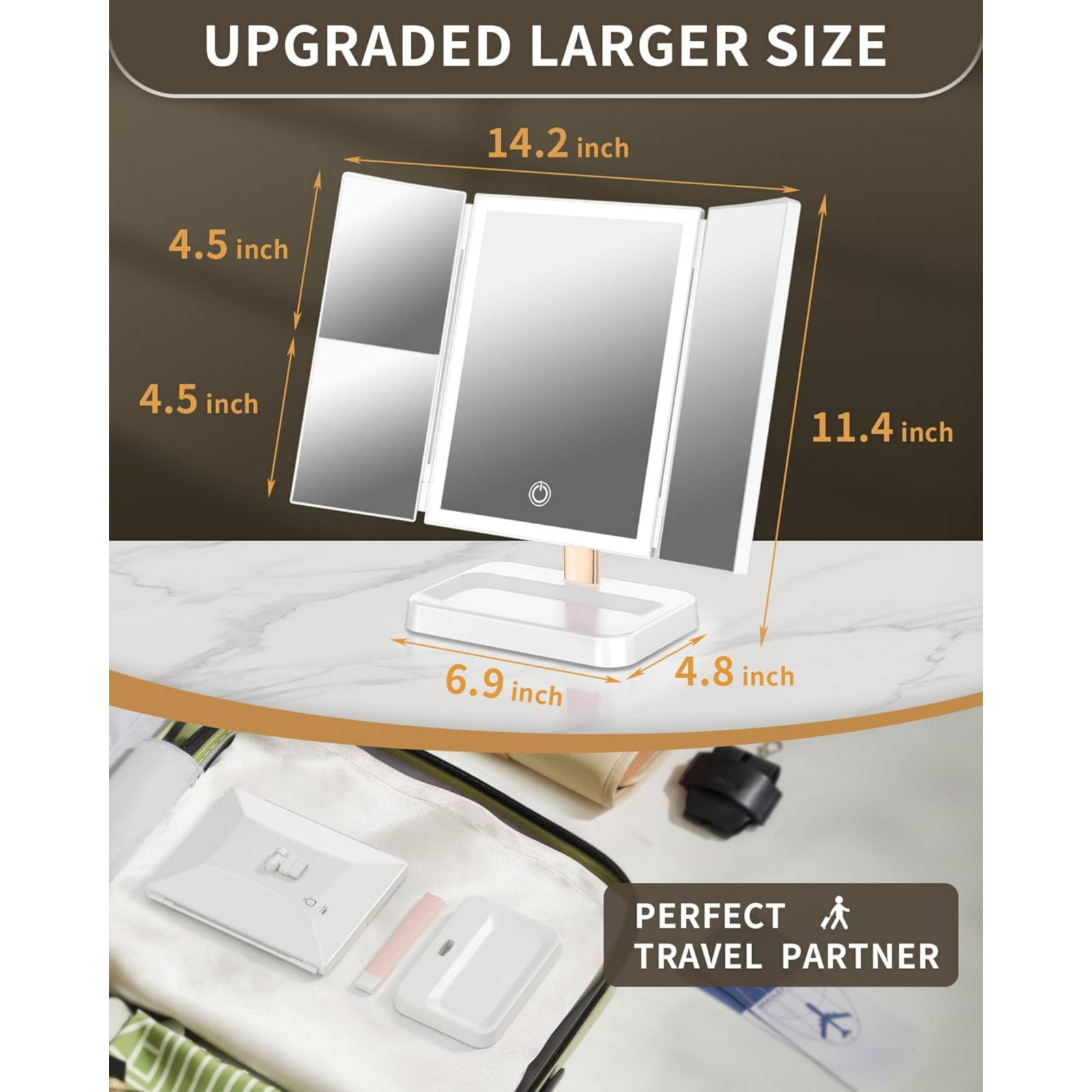 Free eBay listing template designed by dewiso.com Makeup Mirror with lights, 14.4" x 9" Dresser Mount Rechargeable Lighted Vanity Key Features: Rechargeable & Wireless : No need for batteries. With a built-in 2400mAh battery, this mirror ensures long-lasting use after a full charge. Includes a USB-C charging cable. High-Brightness LED Beads : Equipped with 78 non-glare LED beads that are easy on the eyes, offering clear lighting for precision makeup application. Ideal for gifting on birthdays, holidays, or any occasion. Touch Control & Adjustable Brightness : Single press to toggle between different color temperature modes, or long press to adjust brightness levels. The mirror remembers your preferred brightness settings for future use. 3 Color Light Modes & 1X/2X/3X Magnification : Choose from warm, natural, or daylight modes to suit any setting. Side magnification helps focus on details like eye makeup or lipstick with enhanced clarity. 90° Rotation & Storage Base : The mirror rotates 90° for customizable angles. The sturdy base provides space to store small accessories like lipsticks, earrings, rings, or makeup brushes. Perfect Size : Compact dimensions of 14.4"L x 9"W make it ideal for personal use on any vanity or tabletop. Upgraded Rechargeable LED Makeup Mirror – 3 Light Modes, 1X/2X/3X Magnification, and Adjustable Brightness Experience a flawless beauty routine with the Upgraded Rechargeable LED Makeup Mirror . This mirror offers versatile lighting and convenient features to make your makeup application perfect, whether at home or on the go. Contact us We can be contacted at any time through eBay messages if you have any questions, comments or product requests. We will respond to you within 24 hours and do our best to help you out! We encourage our customers to contact us with any questions or concerns! We'd like to be sure you are completely satisfied with your purchase. Payment We accept PayPal, PayPal Credit: Visa, Mastercard, American Express Discover Google Pay and Apple Pay Immediate Payment is required! Shipping We provide FAST, FREE SHIPPING to the Continental 48 US States. We do not ship to Alaska, Hawaii, APO/FPO, PO Boxes, or any US Protectorales. PLEASE PROVIDE A PHYSICAL ADDRESS. Your order will be processed within the allotted time frame. Most items ship out with 1-2 Business Days after payment is received Please not that some orders may be shipped in multiple packages Return If you have any problem with product we can accept return within 30 days after purchase. If you want to return product, you can contact with us ARTFULESSENCE