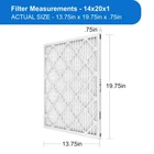 Product details Great Value, known for reliable household consumable products, brings you enhanced indoor air quality at an affordable price! Our Great Value MERV 13 pleated air filters give you healthcare quality air in your home! Our BEST air filters capture & trap indoor contaminants like dust mites, pollen, pet dander, mold spores, bacteria, microscopic allergens, virus carriers, most smoke, odor carriers and smog. These filters are made with a durable, moisture-resistant cardboard frame and electrostatic, wire supported media to ensure their strength. Their pleated design and larger surface area offer more space to capture airborne virus carriers, allergens & other contaminants in your home. When you use the Great Value MERV 13 BEST air filter, you will breathe the cleanest air our brand offers! A single filter from this value pack measures 14x20x1; which means its actual size is 13.75x19.75x0.75 – be sure to measure your HVAC return to ensure proper fit; Captures and traps dust mites, pollen, lint, pet dander, mold spores, bacteria, microscopic allergens, virus carriers, most smoke, odor carrier & smog; 4 count value pack lasts up to 360 days; You should change your pleated air filter every 90 days or sooner depending on your indoor environment; Great Value products provide families with affordable, high-quality grocery and household consumable options
