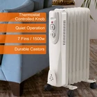 Stay warm and cozy with this powerful 1500-watt oil-filled radiator heater. Featuring 7 fins for optimal heat distribution, this portable heater offers three versatile electric settings to match your comfort needs. The sleek white design includes convenient castor wheels for easy mobility between rooms, while the user-friendly control panel features adjustable temperature settings and a power indicator light. Perfect for supplemental heating in bedrooms, offices, or any living space up to 150 square feet. The oil-filled design provides consistent, long-lasting warmth even after powering off, making it an efficient heating solution. Built with safety in mind, this radiator heater maintains a relatively cool exterior while operating. Its compact yet effective design makes it an ideal choice for those seeking reliable portable heating during colder months. About this item