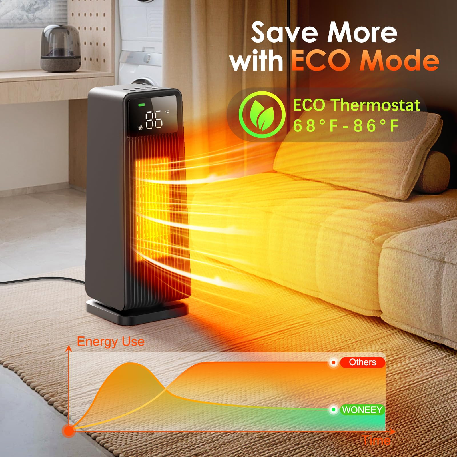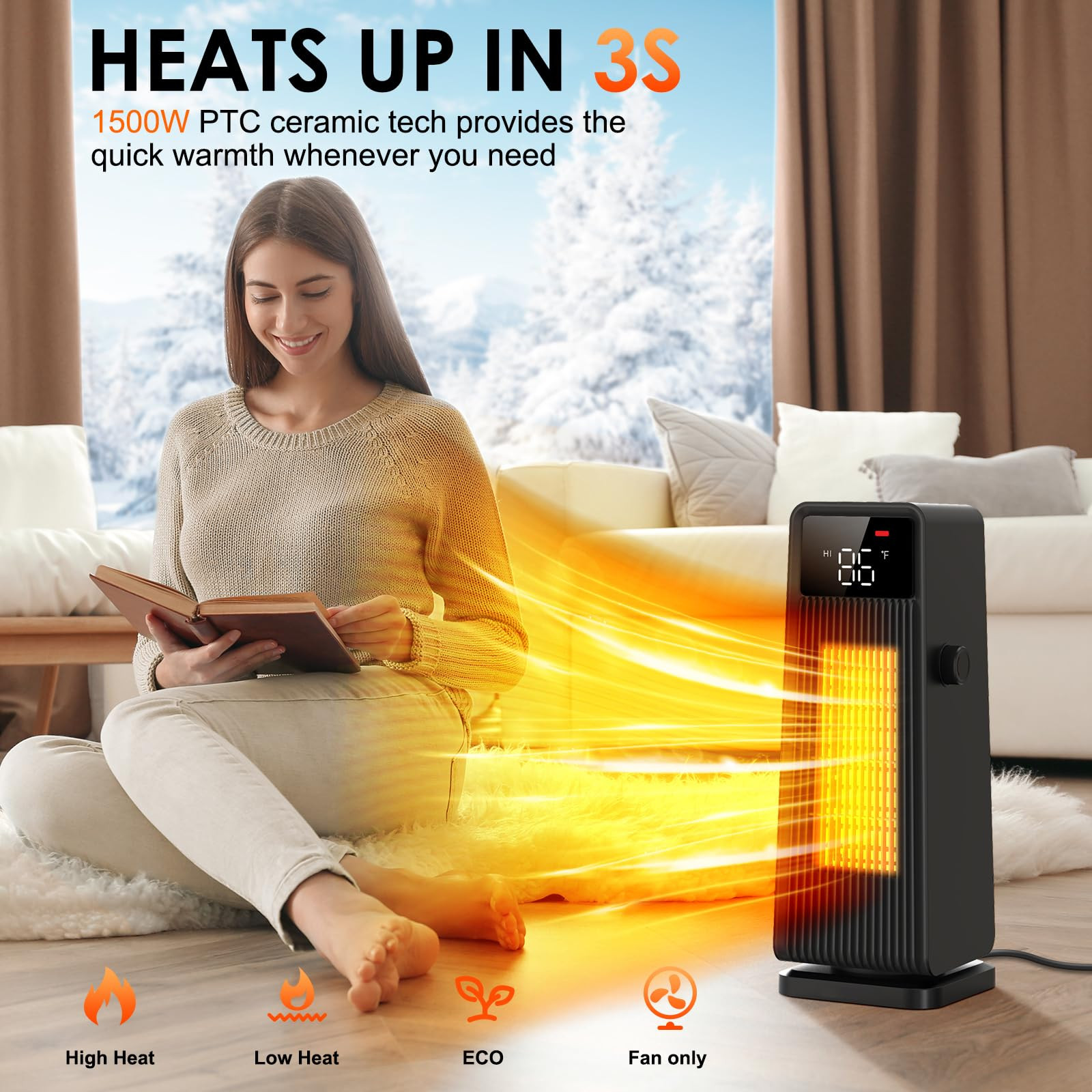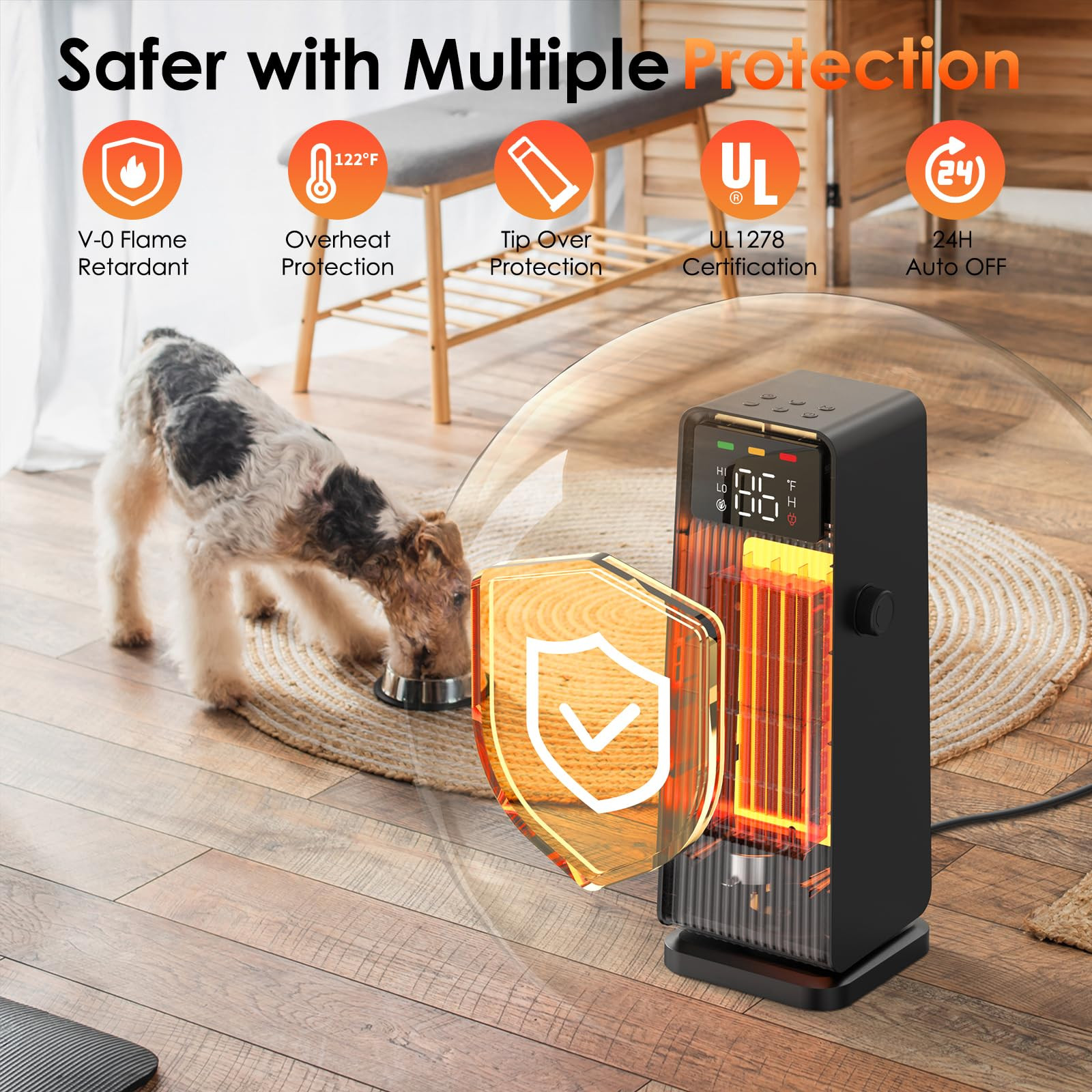 【Multi Protection】Our space heater has passed the UL1278 certification and made of V0 flame retardant material, resisitant to the elctrick shock. The heater also provides overheating protection, tip over protection and 24-hour automatic shutdown to ensure your safety and heat up without worries. 【Energy Saving】This portable heater also has 4 heating modes(High/Low/ECO/Fan Only). In ECO mode, define your desired heat from 68 to 86°F in 1°F increments, the outdoor heater will automatically start or stop heating when the room temperature reaches the set temperature, save more on your energy bills while staying comfort. 【Warm More Areas】 Powerful 1500W PTC ceramic heating tech helps heat up the room quickly. And the electric heater Provides 70° oscillation + 70° up and down adjustment wide-angle heating, greatly enveloping your room in warmth from all directions. Heating Coverage is 200 sq.ft. 【Memory & Timing Functions】Our space heater for bedroom use is designed with 1-12 hours automatic shutdown option and auto-shutdown without operation for 24 hours. In addition, it will always remember your last setting when you turn it on again if the power supply is not disconnected. 【Quiet & Child Lock】The garage heater has a quiet wind wheel design and reducing noise to only 40dB. Also designed with child lock function, just press the control or long press the on/off button of the heater to lock the heater directly. Perfect for families with curious pets and active toddlers.