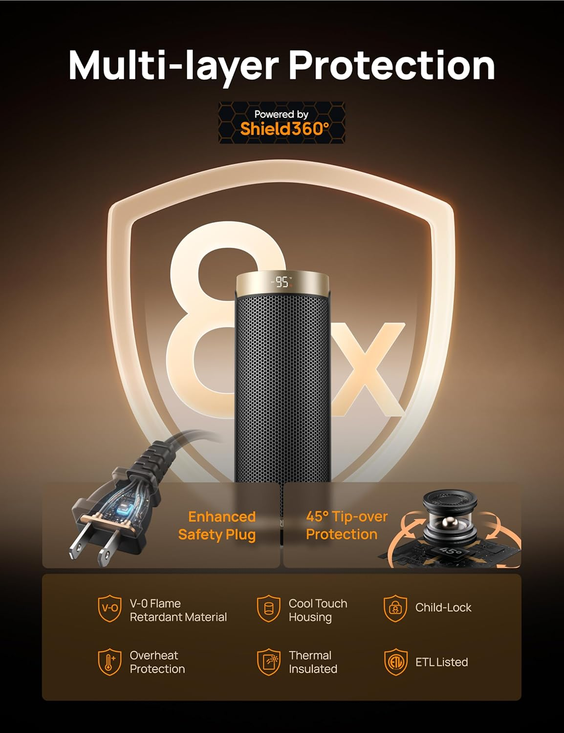 ETL-Certified Safety: Made of V0 flame-retardant materials with multiple safety features including built-in smart tip-over protection, overheat protection, 12-hour timer, 24-hour automatic power off without interaction, V0 flame retardant 2-prong plug, and sturdy 6ft long flat power cord. Safe and worry-free all-day use. Safety Reminder: Please do not use with an extension cord. Only plug directly into the wall outlet. Fast Indoor Ceramic Heater: Powerful 1500W PTC ceramic heating allows this space heater to heat up in seconds, suitable for warming up spaces in the home including bedrooms, basements, garages, living rooms, and can also be used in offices, dorms, hot yoga studios, etc. Heating Coverage:200 sq.ft. Quiet Heating: 40dB - almost as quiet as a library. The fan wheel uses oblique airflow technology, which effectively reduces wind noise and makes the room heater 12% quieter than traditional electric heaters. Calm airflow lets you sleep soundly and work undisturbed during the cold winter Uniform Heating: Experience enhanced comfort in large rooms with the exclusive trackball system, engineered for smooth and whisper-quiet oscillation. The 70° wide-angle oscillation, with a lifespan of over 750,000 cycles, boosts heating coverage by 20%, which helps distribute the warm air more evenly towards the room's corners Energy Efficiency: Save on energy bills and live more sustainably. With a built-in precise temperature sensor, the smart ECO mode adjusts the working mode independently (with a low of 900W and high of 1500W to efficiently maintain your desired indoor temperature) based on the ambient temperature Usage Comfort: The touchscreen is placed on top of the heater for easier reach, and the remote provides full access from up to 26 feet away. The 16-inch compact design makes our space heater a real space saver that is easy to move around with its hidden handle. Cord Lenth: 6 ft / 1.8 m Product Description Dreo Portable Space Heater Family Add to Cart Add to Cart Add to Cart Add to Cart Add to Cart Add to Cart Add to Cart Customer Reviews 4.5 out of 5 stars 11,729 4.6 out of 5 stars 12,890 4.6 out of 5 stars 2,138 4.4 out of 5 stars 10,097 4.3 out of 5 stars 740 4.3 out of 5 stars 2,141 4.5 out of 5 stars 1,432 Price $69.99 $ 69 . 99 $39.99 $ 39 . 99 $59.49 $ 59 . 49 $95.26 $ 95 . 26 $129.99 $ 129 . 99 $106.03 $ 106 . 03 $99.99 $ 99 . 99 Height 16" 10" 16" 25" 30" 26" 16" Mode Options H1/H2/H3/ECO/Fan H1/H2/H3/ECO/Fan H1/H2/H3/ECO/Fan H1/H2/H3/ECO/Fan H1/H2/H3/H4/H5/ECO/F1/F2/F3 H1/H2/H3/ECO H1/H2/H3/ECO/Fan Adjustable Thermostat 41-95 °F (In 1°F Increments) 41-95 °F (In 1°F Increments) 41-95 °F (In 1°F Increments) 41-95 °F (In 1°F Increments) 41-95 °F (In 1°F Increments) 41-95 °F (In 1°F Increments) 41-95 °F (In 1°F Increments) Oscillation 70° — 70° 70° 30°-60°-90°-120° 360° Three-dimensional Heating 30° manual oscillation Sound Level 34 dB 34 dB 34 dB 37.5 dB 25 dB No noise 28dB Built-in Timer 1-12 H 1-12 H 1-12 H 1-12 H 1-12 H 1-24 H 1-24 H Remote Control ✔ ✔ ✔ ✔ ✔ ✔ ✔ ETL-Listed ✔ ✔ ✔ ✔ ✔ ✔ ✔ Power 700-1500 Watts 1000-1500 Watts 1000-1500 Watts 900-1500 Watts 300-1500 Watts 600-1500 Watts 900-1500 Watts