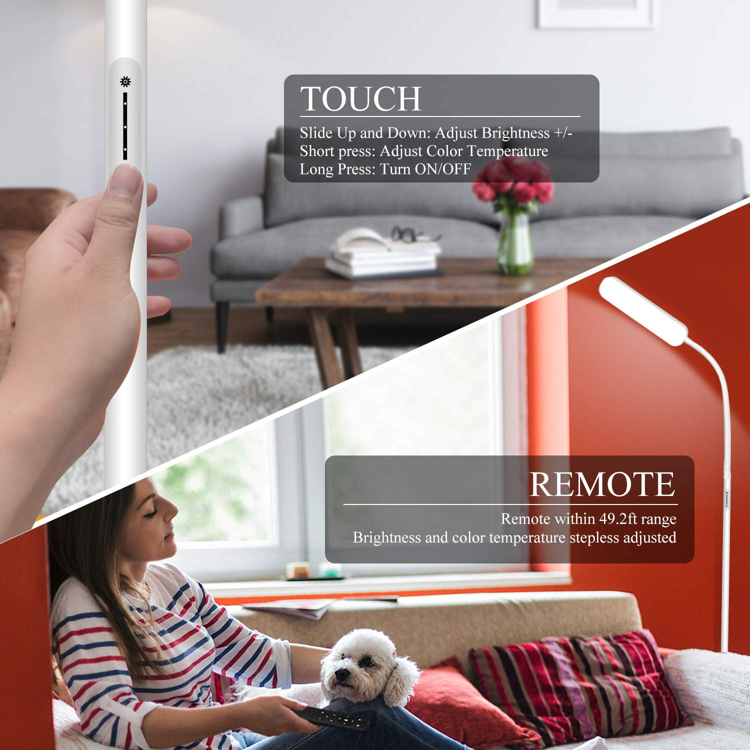led remote floor lamps Remote Control; adjust brightness and color temperature steplessly with the remote control from up to 49.2 feet away; customize the lighting mode to suit different environments; the remote includes 6 scenes that can be activated with a single click Touch control; stepless adjust the brightness from 5% to 100% and there are 4 color temperatures that can be adjusted 3000k, 4000k, 5000k, 6000k; upgrade to the superior touch, better feel, better control Bright and Soft Light: Powered by a 15W LED, this lamp generates 1000 lumens, making it ideal for reading in the living room or bedroom, with a lifespan of up to 50,000 hours, it has soft natural light without flicker Memory and Timer Functions; the lamp features a memory function that recalls your last brightness and color settings, along with a timer to help you feel secure and fall asleep easily Flexible gooseneck; the 360-degree adjustable gooseneck can direct the light to the position you need; the gooseneck can be easy bent and will maintain its position after bending