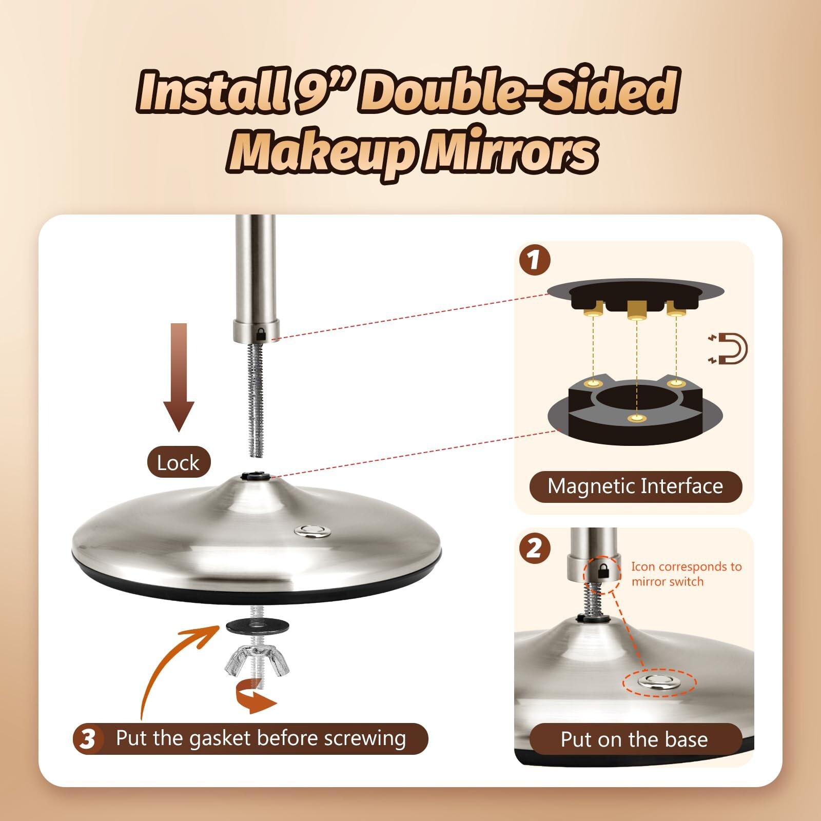 15X Magnifying Mirror with Light: 9 inch Lighted Makeup Mirror with 3 Colors, 360°Rotation Touch Screen Rechargeable Light up Mirror, Double Sided LED Vanity Mirror, Brushed Nickel Product Details Color: Brushed Nickel Material Type: 15X Brand: VORREMIRR MPN: D954 UPC: Does not apply EAN: Does not apply Brand: VORREMIRR Room Type: Bedroom Shape: Round Product Dimensions: 17"L x 11"W Frame Material: Metal Brand: VORREMIRR Room Type: Bedroom Shape: Round Product Dimensions: 17"L x 11"W Frame Material: Metal Style: Modern Mounting Type: Tabletop Mount Finish Type: Brushed Special Feature: 2-Sided Color: Brushed Nickel Number of Items: 1 Material: 15X Assembly Required: Yes Manufacturer: VORREMIRR Size: 17"L x 11"W Item Weight: 2.8 pounds Country of Origin: China Item model number: D954 Batteries: 1 AA batteries required. (included) Date First Available: September 30, 2024 9'' Large True HD Magnifying Mirror Our magnification makeup mirror equips with professional lamp beads, And the illumination level of this light up mirror reaches 1800LuX. Color rendering index (CRI) exceeds 97, others about 80. Unique Soft eye-protection natural light source. Provide the most natural makeup in the dim environment. This lighted makeup mirror with magnification boasts an 9" surface, letting you see every facial detail clearly. Smart Touch on the Base & Base Charging The lighted makeup mirror incorporates advanced technology, allowing the mirror to be electrified once connected to the base, with a smart touch button on the base for switching the power on and off. Touch switch gently to change the 3 colors light modes and double click the base switch to turn off the light. The base touch switch can reduce fingerprint residue on the mirror surface, providing buyers with a better user experience. 1X/15X Double-Sided Tabletop Mirror Experience the precision of 15X magnification for intricate makeup applications and skincare routines, and a 1X side for a complete, natural view. When using a 15x magnifying mirror, please keep your face within 3 inches away from the mirror to avoid dizziness. The desk mirror supports 360-degree rotation, making it convenient for users to view their makeup from different angles. 3 Color Lights & LED AdjustableThis desktop makeup mirror is equipped with three light colors: cool, natural, and warm light, which create the most perfect makeup under various lighting situations like working, party, and outdoor environments. Just touch the sensor switch to switch between light and color, long press to adjust the brightness, double-click to turn off light.Our mirror for desk has a 30-minute scheduled shutdown and memory function. It will remember the last brightness you used. 360 Rotation & 2000mAh Rechargeable Mirror Built-in 2000mAh battery, charged through the Type-C port on the base, making it convenient for users to use without being plugged in, which to avoid entanglement of data cables. 360 free rotation, so you can adjust it to the angle you want and switch between the 1x and 15x mirrors. This mirror has completely changed my makeup routine! Please check that all accessories are complete before installation.
