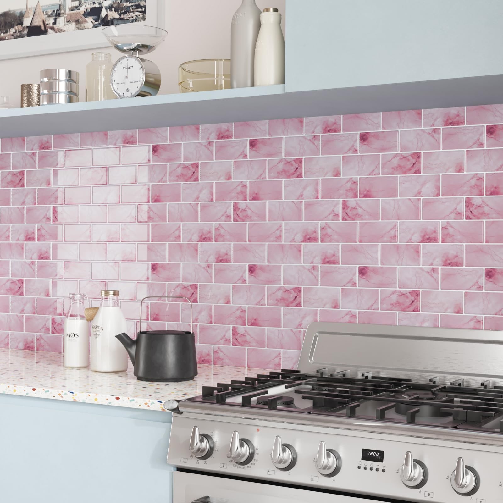 pink peel and stick backsplash for kitchen subway tile pink marble peel and stick tile for bathroom back splash stick on tile stickers waterproof 3D Subway Tile: Kitchen backsplash peel and stick, pink marble tile stickers, with white grout lines, glossy finish. Sheet size is 12"x12"x0.05", chip size is 3.3"x1.9", each box of 16 sheets covers 16 square feet Features: Peel and stick subway tile backsplash, made of durable PU glue and PET backing paper, no yellowing, color loss or cracking with long-term use, waterproof, oil-proof, easy to clean, impact-resistant, heat-resistant (from -30°C to 80°C) Easy to Install: Kitchen backsplash tiles peel and stick, self adhesive, no grout, no glue, no mess, easy to cut, lightweight, flexible, bends to corners, easy to apply, removable backsplash for renters, no residue left behind Wide Application: Peel and stick backsplash for kitchen, peel and stick tile for bathroom, back splash stick on tiles for kitchen backsplash, behind the sink, behind the stove, bathroom vanity backsplash, shower walls, laundry room, dining room, girls room, living room, fireplace, RV, wall tiles Warm Tips: *Please ensure that the tile is applied on a smooth, flat, dry and clean surface, it is not recommended to use it on uneven, textured, rough or dusty surfaces. *Due to the difference in device screens, the actual color may vary slightly from the picture, we recommend that you order 4 sample tiles to check and make further decision. *It is recommended to order 10% more tiles to account for cutting loss during installation