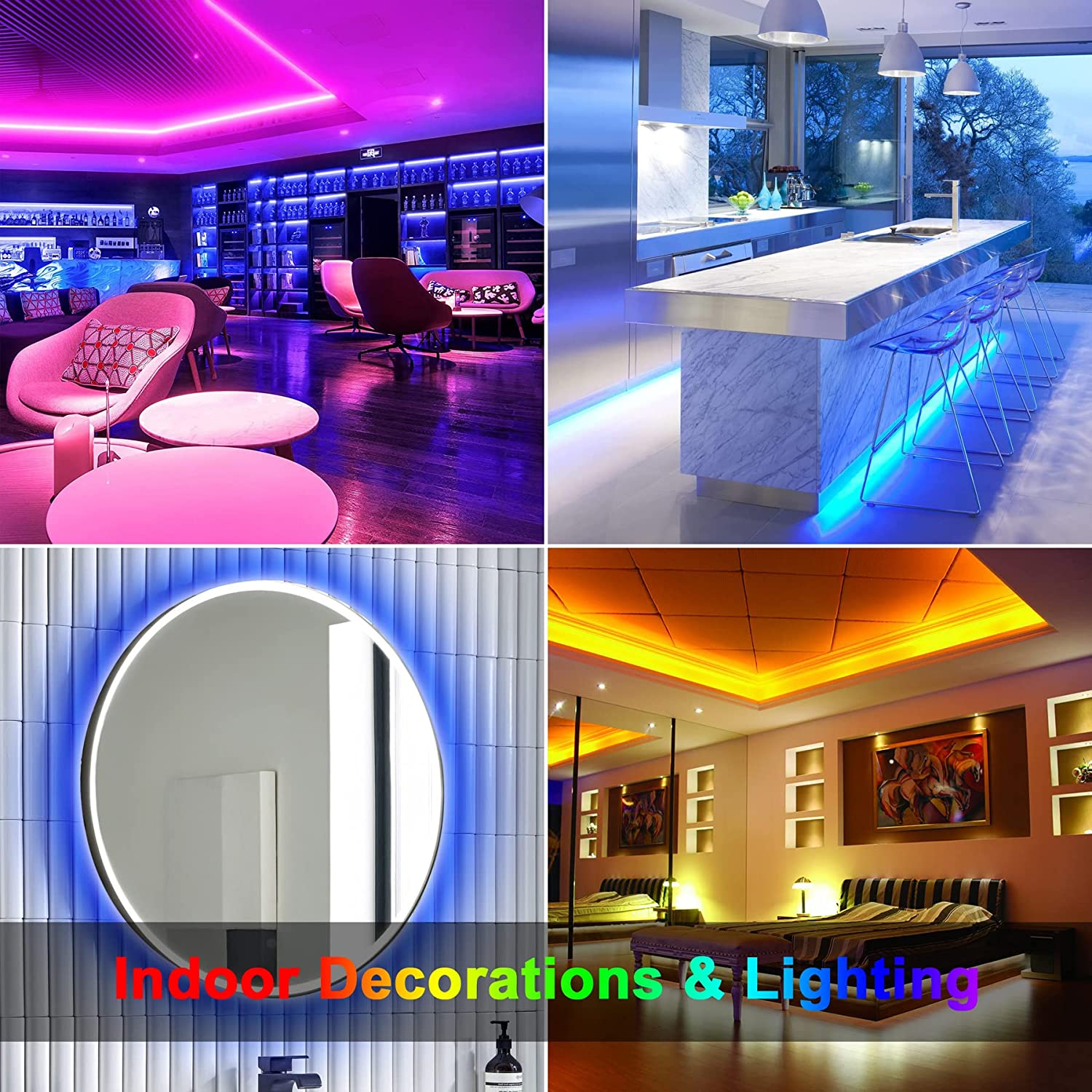 【RGB Strip Lights with 16 Color Changing & 4 Modes】sylvwin 16.4FT RGB LED strip comes with not only RGB, white,green, and other colors, but also 4 Modes DIY options. With adjustable 6-level brightness, the strip light can be changed to warm or bright. You can DIY the light strip according to the size of your room to make it fit the furniture you need to decorate. 【Cuttable and Linkable】The LED lights can be easily cut and linked with other strip LED lights, which can be cut every 3 LEDs along with the cutting marks. You can also customize the length of the led lights, while arrows of the lights should be faced with each other when connecting. (Please note that if you want to reuse the cut part, you need to buy a connector to make it work again) 【Strong Adhesive &Easy Installation】All-in-one package, no additional tools required. 16.4FT LED light strip on the back comes with strong double-sided glue and equips with multiple buckles. It ensures the stickiness of the light bar while being easy to install. The self-adhesive tape can be fit on any dry and flat surface. Flexible to install anywhere you want. 【24-Key Remote Control &12V Safe Voltage】 The led strip IR remote controller makes it more convenient for you to control the light strip. All you need to do is connect the power supply and use it directly, and the IR remote control has overload, short circuit protection, and memory function. (Please note that the arrow position of the controller must be aligned with the "+ 12V" light strip mark, otherwise the light will not turn on.) 【Wide Application】RGB led strip lights are a suitable ornament, transforms your home's atmosphere, for kitchen, ceiling, back of the tv, desk, stairs, bar, Halloween,Christmas tree. 【Notice】If you want to DIY, please cut at the mark. Note, that if the cut part needs to work again, you need to use the connector separately (not included with this product).5M cannot use APP function, only 10M, 20M, 30M can use APP. 【Do not】We do not recommend that you stick the light bar on smooth places such as glass, wood, etc. Please wipe off water, dust, oil and other things before you stick it.