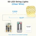 Welcome to the world of LED String Lights Battery Operated 16.4 FT LED String Lights Battery powered, 50 LED Warm White String Fairy Lights with IR Remote Control, ideal for bedroom, wall, backdrop, window, Birthday, Party, Valentine’s Day, Thanksgiving Day, Halloween, Christmas Decorations. Perfect Christmas String Lights 8 light scene options to choose from, add some sparkle to your space, whether it's for practical use or for creating a magical atmosphere for Christmas Day,with the battery powered fairy lights that can serve as the perfect backdrop to give the perfect ambiance. Indoors & Outdoor Decor Transform any room into a dreamy paradise with the magical glow of these battery powered string lights for bedroom, kitchen, stair, dining room, living room area, the fairy string lights can also be used as outdoor string lights for a warm and inviting backyard gathering. Easy to Control With IR remote & button control, you can switch the battery powered string lights on/off and customize the settings, including scene modes, Brightness levels and Timer, to fit your mood from the comfort of your sofa. Safe and Easy Installation Powered by 3 AA batteries, no more worry about overheating or electrical malfunctions as the string lights are designed with safety in mind and easy to install. Premium Quality and Extras They are also made from high-quality wires and LEDs, ensuring they last for a long time. Specifications: Size: 16.5 FT LED Quantity: 50 LED Lights LED Color: Warm White Power: Battery Control: IR Remote/Button What You Get 2 x LED String Lights 1 x IR Remote 1 x User Guide Bright Warm White: 16.5ft battery operated string lights with 50 warm white (2700K) LEDs, beautiful fairy string lights are ideal for decorating bedroom, kitchen, stair, dining room, living room area, gardens, patios and more. Create a warm and inviting ambiance wherever you need it. 8 Lihgting Modes & Dimmable: The string lights battery powered come with 8 light scene options and 4 dimmable brightness levels to choose from, you can customize your lighting to suit different occasions, moods, feelings, holidays, festivals, anniversaries, etc. Perfect for Wedding, Birthday, Party, New Year, Valentine’s Day, Thanksgiving Day, Christmas Decor. Timer & Meory Function: With an automatic 6 hours on/18 hours off timer, and the memory function remembers your settings, no need manually reset them daily. IR Remote & Button: Conveniently manage the string lights battery operated via IR remote or button, easily adjust Lighting modes, Brightness levels and Timer. Safe & Wateproof: Powered by 3 AA batteries, ensuring safety and portability. IP65-rated waterproof and durable PVC wire material,high quality twinkle lights, enjoy battery operated Christmas string lights indoor and outdoor no matter the weather. (Note: 3 AA batteries not included in package)