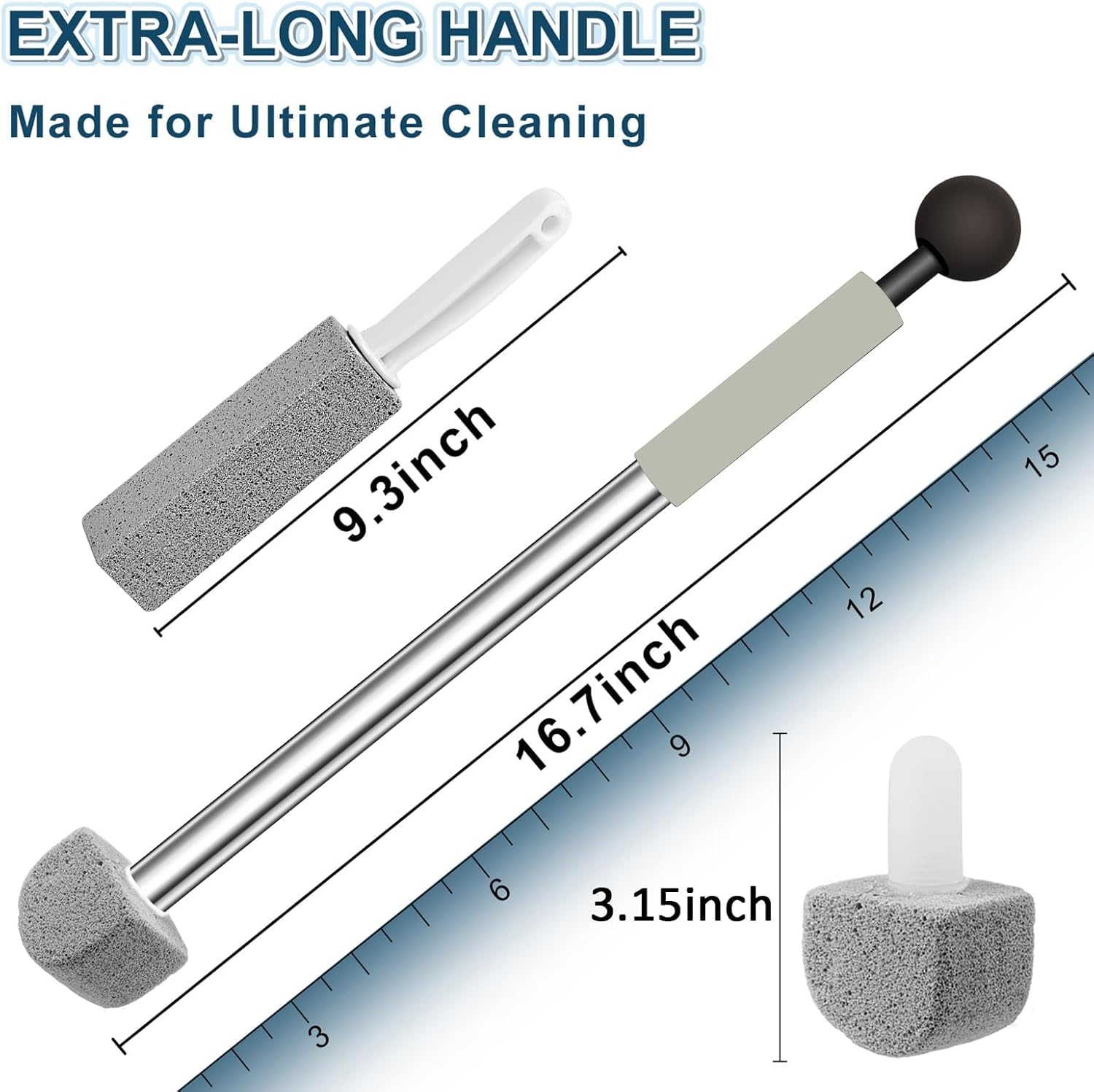 [Natural Pumice Stone for Cleaning]---Pumice stone toilet bowl cleaner with long handle is made from stainless steel and plastic handle and 100% natural pumice.For long time use,be sure to rinse the pumice stone thoroughly and store it in a dry place until the next use. [Extra Long Handle/Larger Size Pumice Stone]---NEW VERSION Pumice stone toilet bowl brush the size:16.71*1.77*1.6inch/42.5*4.5*4.2cm.Pumice sticks for cleaning is an easy-to-use cleaning tool that is designed to help remove clr calcium,lime&rust remover and hard water stain remover.It's a good toilet scrubber tool for everyone daily needs. [For Multiple Surfaces]---Wet the pumice stick for toilet cleaning before use,you can test it on a small area.Toilet wand refills are used to clean calcium deposits,limescale and hard water rings on toilets, toilet bowls,sinks,bathroom tiles and ceramic surfaces,also be used to remove rust and grease from grills and ovens.After cleaning with the toilet pumice, flush the toilet several times to remove any remaining debris or residue.Make bathroom cleaning easier and more efficient. [Easy Attach/Disposal]---The disposable toilet brush refills easily attach,and eject for disposal by simply pushing the sphere at the top of the wand. [Package Included]---You will get 1 toilet pumice stone with handle+8 pumice stones,if you need extra toilet pumice stone replacement Refill available , you can choose another link to buy. Any questions please feel free to contact us, we are happy to solve all your concerns. Product Description Yingmore Toilet Pumice Stone with Handle for Deep Cleaning CLEANS EFFECTIVELY-- This pumice stone for cleaning is made of pumice,sturdy and high density.Easy to clean,it won't scratch your toilet.Clean toilet rings,iron deposits,and more on toilet bowls in several minutes.Even the corner can be easy to clean, you needn't hard to cleaning corner. LARGER EXTRA LONG TOILET BOWL CLEANER NEW VERSION--Toilet Pumice Stone for Cleaning with Handle--Keep Your Hands Clean Our pumice stone for toilet cleaning comes with 1 toilet handle and 8 pumice stones.Long 42.5CM/16.7Inch pumice toilet bowl cleaner with handle special designed for cleaning your toilet bowls, sinks, tubs, tiles, or other surfaces. pumice stone toilet bowl cleaner with comfortable ergonomic handle design,easy to grip and maneuver.Versatile and convenient cleaning tool for busy households. Package Included: 1 toilet pumice stone with handle+8 Pumice The video showcases the product in use. The video guides you through product setup. The video compares multiple products. The video shows the product being unpacked. pumice stone toilet bowl cleaner Merchant Video Pumice Stone Toilet Bowl Cleaner with Long Handle Specifications A Great Gift Choice-Disposable Toilet Handle with 8 Pumice Stone for Replacement A Great Gift Choice-Disposable Toilet Handle with 8 Pumice Stone for Replacement