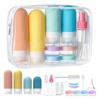 Useful Travel Accessories - This is a practical travel container set inside a zipper box, which includes 4 travel bottles, 4 travel jars, 2 spray bottle, 2 spoons, 1 funnel, 1 cleaning brush, and 1 label, as well as 1 transparent makeup bag. The diverse containers allow you to bring different beauty products and cosmetics according to your needs. Lightweight and Portable - All travel accessories are packed in a handy bag, fits in any small space, easy to take on the go and save your toiletry space. Perfect for travel, vacation, plane trip and camp. 1. 100% BPA free food grade silicone. Very safe & durable to use. 2. The wide bottle mouth makes it easy to empty, clean, and refill the bottles in minutes. 3. Perfect for business or personal travel, activity, outdoors and more 4. Could be a perfect gift for friends or family. Tips: 1. Filled the bottle with the 3/4 total volume is enough. As it may cause the caps to not seal properly. 2. The travel bottles are reusable.