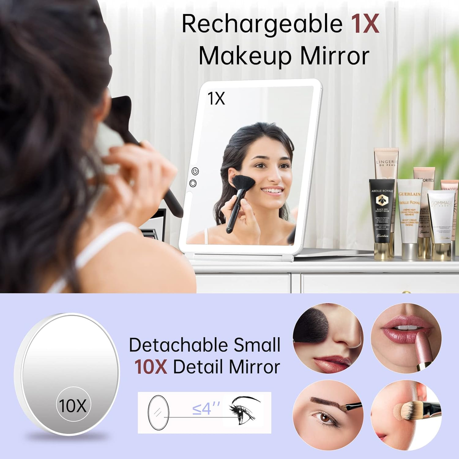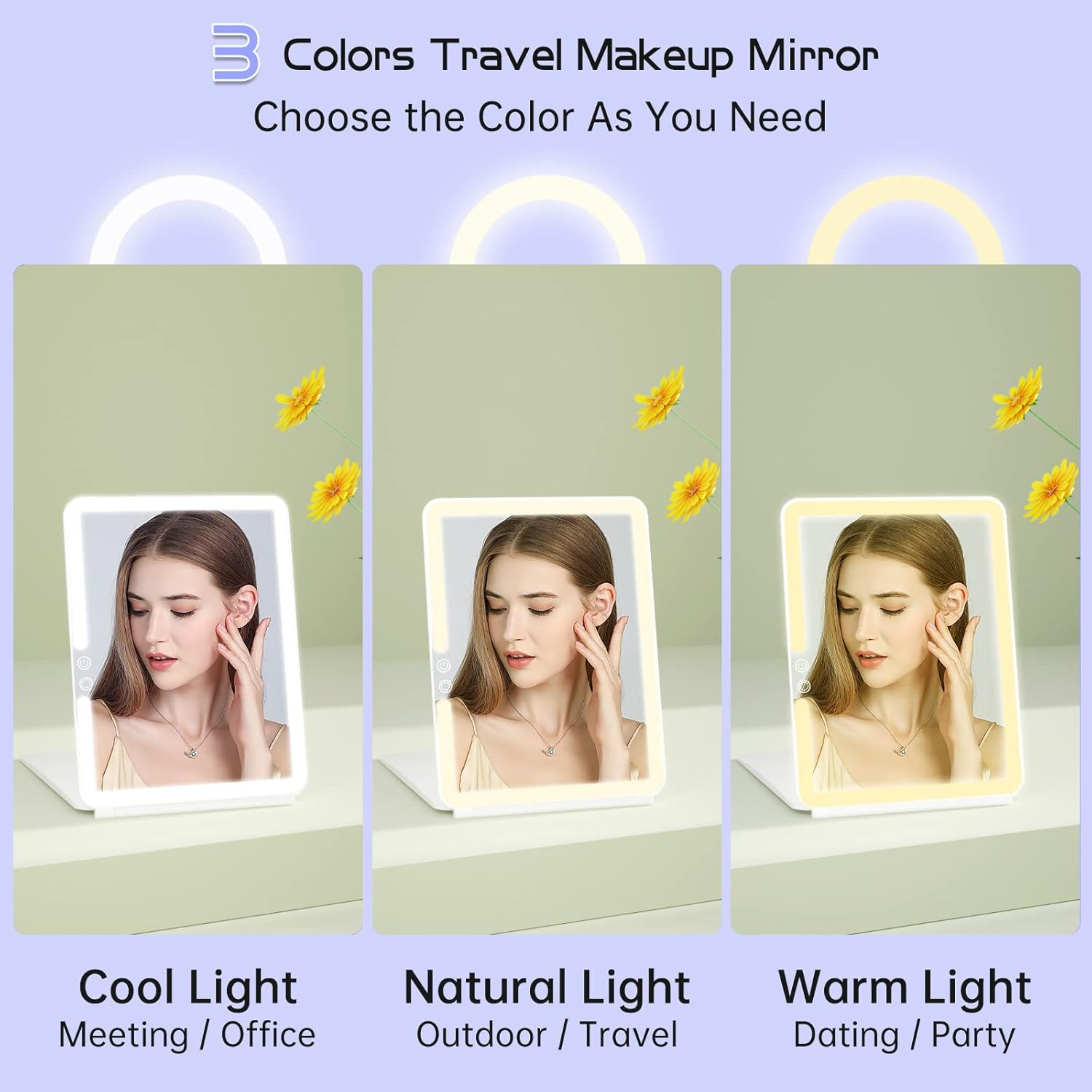 💡 Warm Tips for Power Switch: Please Check if You Have the Power "ON" Before Use 💡 The main 1x mirror is about the size of “A4 paper” 【The best travel essential choices】Ever go to a hotel and the lighting in the bathroom is horrible? Or there's no counter space? Traveling and sharing a space with others? With this mirror, that is no longer an issue. No longer have to get ready in the bathroom, can prop up the mirror anywhere and do your makeup even do your hair. 【1X Makeup Mirror & Detachable 10X Magnifying Mirror】1X light up makeup mirror is suitable for overall makeup and daily skin care. You can easily watch the full face effect. The small 10X magnified mirror is detachable. It can perfectly help you to precisely make up such as eyebrow trimming etc. 【1800mAh Rechargeable Lighted Makeup Mirror】The travel mirror with light has a built-in 1800mAh rechargeable lithium battery, which can work continuously for up to 2.5 hours. It can be charged by connecting a charger or PC through the included Micro USB charging cable 【Portable Lighted Makeup Mirror】This travel lighted makeup mirror measures: 10 x 7.5 inches and is 0.8 inches thick when folded. The ultra-thin, lightweight and compact design will make you fall in love with it while traveling 【3 Colors Travel Mirror】This cosmetic mirror has 72 built-in LED lights with 3 color lighting modes. Short press the color button to switch between cool, natural, warm light color temperature. The makeup mirror are naturally soft, bright and not dazzling Product Description Folding Makeup Mirror with 3 Color Lights for Desktop 1800mAh Rechargeable Travel Makeup Mirror, No Worries for Power Off Anymore The video showcases the product in use. The video guides you through product setup. The video compares multiple products. The video shows the product being unpacked. Best Desktop and Travel Portable Led Makeup Mirror! Warm Tips for Power Switch Please Check if You Have the Power "ON" Before Use 1X Travel Makeup Mirror with Small Detachable 10X Magnifying Mirror Protable Travel Makeup mirror, Travel Size, Using Everywhere Ultra-thin Portable Design The travel size of the makeup mirror is about 10"L x 7.5"W, 0.8-inch thickness when folded. You can easily put it into your handbag or luggage for perfect travel use. Portable Travel Makeup Mirror Folding travel vanity mirror is ultra-thin and lightweight, and fits easily into your bag for travel or work use. Travel Led Makeup Mirror with 3 Color Lights, Smart Touch Dimmable Brightness! Perfect Gifts at at Any time, Like Christmas, Birthday, Valentine's Day Ect.