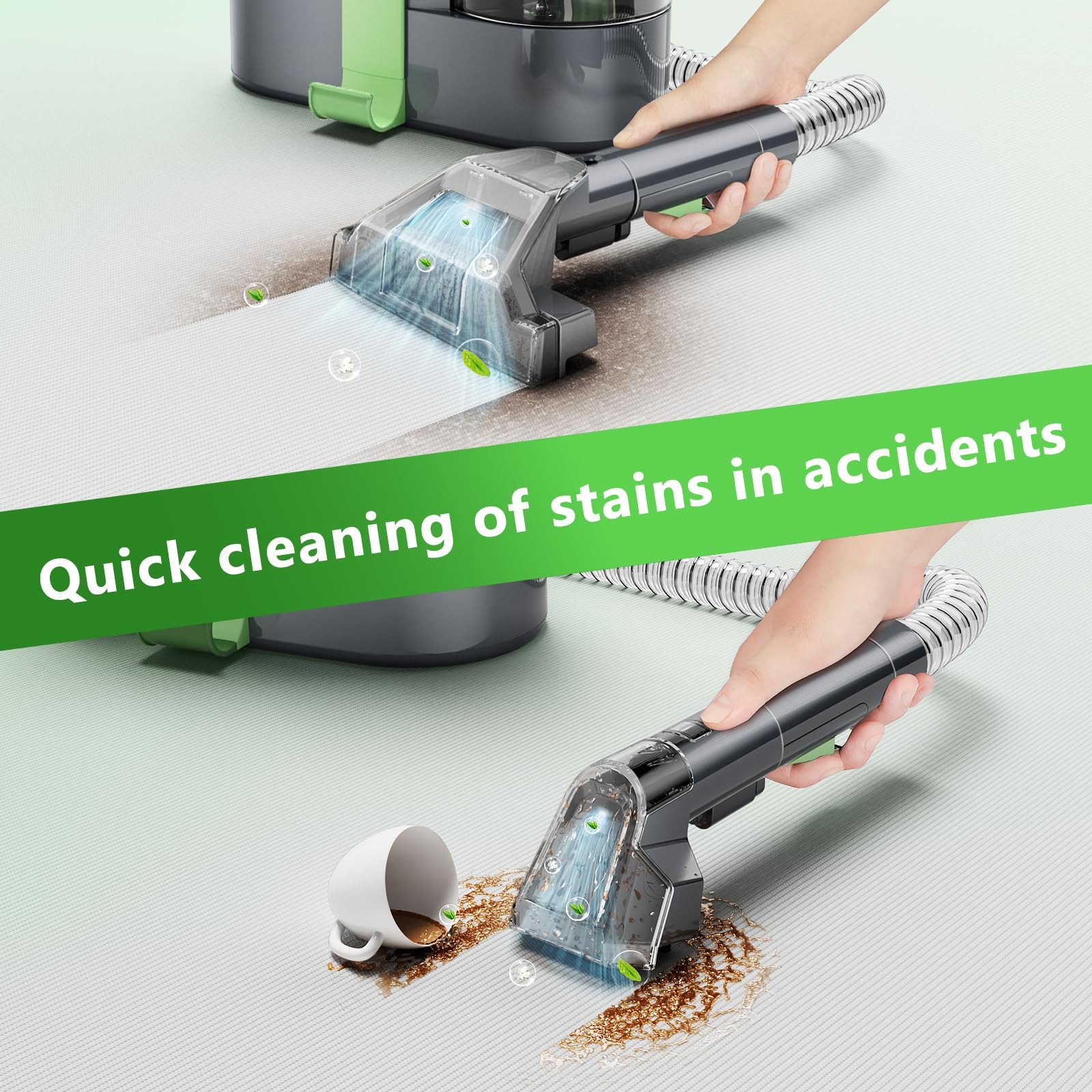 Carpet Cleaner Machine, 18 Kpa Portable Carpet Spot and Upholstery Cleaner, 500W Powerful Suction Deep Couch Cleaner Machine with Handle for Pet Stains, Sofa, Car Seat, Furniture 【POWERFUL SUCTION FOR QUICK REMOVAL】POITYL carpet cleaner machine is equipped with a 500W motor, which can provide a super suction force of 18Kpa, which can permanently remove stubborn spots and stains like mud, wine, pet messes and more from carpets, upholstery and car interiors. Also, equipped with a strong suction system, ensure that the carpet can dry quickly after cleaning, quickly return to its normal state. 【DUAL WATER TANK & BRUSH HEAD】0.80L sewage tank and 1.50L clean water tank are stored separately, allowing you to easily disassemble the water tank for filling, draining, and cleaning. Tips: The water volume of the dirty tank can't exceed the MAX line, otherwise it may cause the suction of the couch cleaner to stop. The upholstery cleaner machine is equipped with two sizes of brush heads, which can be used for stains in different areas. 【PORTABLE CLEANING】The upholstery cleaner machine comes with an ultra long hose (5.57ft) and power cord (17.06ft), and the small carpet cleaner machine is lightweight and easy to move from one cleaning job to the next. The brush and power cord can be stored on the machine's hook to save space. 【TOOLS FOR EVERY MESS】The carpet cleaner machine is for fabric cleaning that cannot be cleaned as a whole, such as sofa, mattress,car seats,and other hard-to-clean items, conserving water resources and minimizing damage to carpeted furniture caused by repeated cleaning, thereby extending its service life. 【7×24 Hour Customer Service】We are confident in this Carpet Cleaner Machine and so will you. If for some crazy reason you are not 100% satisfied or your Carpet Cleaner Machine accessory is damaged, please feel free to contact us! We will solve the problem for you quickly. Don't worry about after-sales service! We will always be at your service.