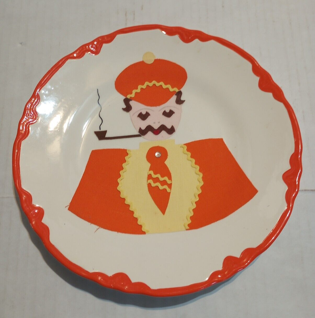 1950s Vintage Folk Art Felt Mr & Mrs Kitschy Wall Plates in Orange & Yellow