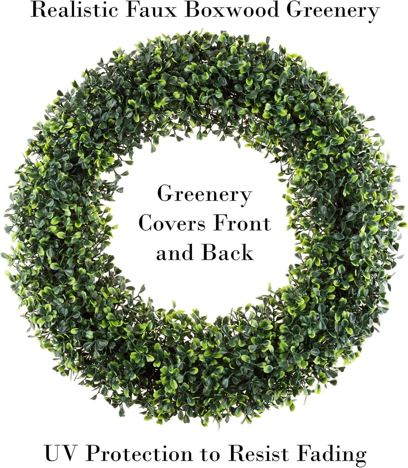 19.5-INCH WREATH - The faux boxwood door wreath is UV-protected to resist fading in sunny conditions, so it maintains a vibrant hue over time. These versatile all-season wreaths are perfect for summer, fall, winter, or spring door décor. LIFELIKE DESIGN - The vivid greenery of the front door wreath is full of natural-looking color variations and enhanced with embedded faux twigs to give the boxwood wreath a lush and lifelike appearance to your kitchen, living room, or front door décor. ALL-SEASON USE - Add some colorful berries to transform it into a holiday wreath or create fall and spring inspiration with a welcoming classroom door decoration by attaching golden-hued artificial leaves or flowers to the rich green faux foliage. LOW MAINTENANCE - This outdoor wreath needs no special care to keep it looking fresh and clean. Simply dust the wreaths for front door occasionally or wipe the leaves with a soft cloth to keep them looking great for year-round use indoors and out. PRODUCT DETAILS - Materials: Plastic. Dimensions: (L) 19.5" x (W) 19.5" x (H) 2.5". Weight: 2.25lbs. Color: Green.
