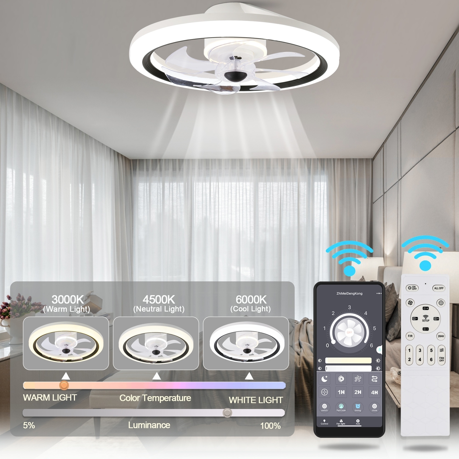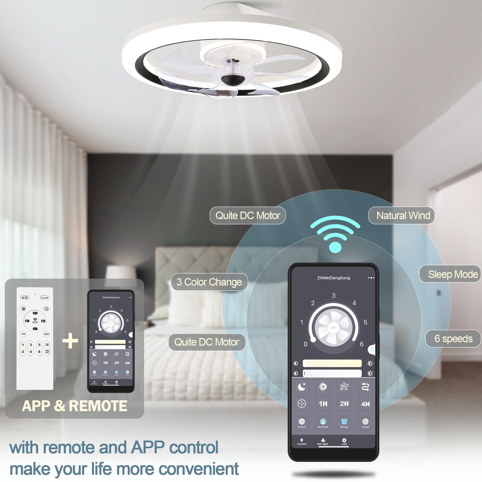This ceiling fan is a game-changer! The matte white finish adds a sleek, modern touch to any space while the ultra-quiet motor keeps things peaceful. Love the 6 adjustable speeds and 3 lighting tones—perfect for any mood. The app control makes it so convenient to adjust everything from across the room. Highly recommend for both style and comfort!