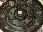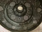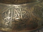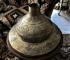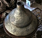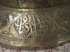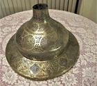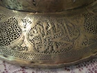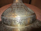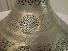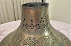 Exquisitely Ornamental Pierced Islamic Geometric Metal Work Nineteenth Century through the Twenties Brass Floor Lamp Base - Only 12" High (the lamp was probably as high as 5') Non-electrical / Unwired - in great condition - none of the piercing is broken Covered all over with Arabic calligraphy and complicated geometrical piercings The geometrical cartouches are all different - no two are the same A few very minor dents - no broken metal Islam prohibits human depictions and this taboo has cultivated the most amazing artistry of calligraphic - geometric design from mosque architecture to home furnishings and books This gorgeous piece has been hanging upside down as a "flower pot" from my ceiling - I rigged it inside a heavy duty macrame plant holder with lots of peacock feathers - it hung upside down for many decades It measures 12" from top to bottom 19" in diameter at the base and 3" at the narrow top where it had been cut off from the original floor lamp Could use light cleaning but the patina is beautiful This is from a huge collection of items from my father's shop in Brooklyn which closed several decades ago. "Old Brassware" was located on Coney Island Ave near Dorchester Rd. in Flatbush and my father bought large amounts of architectural metal from old NYC buildings as they were torn down or renovated during the 1960s and 70s. Everything I sell is from a strictly non-smoking environment I will definitely accept returns only if I have incorrectly described the item I respond quickly to all inquiries Items will be mailed promptly within a day in clean and securely wrapped boxes or postal envelopes