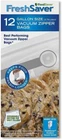 12 gallon-size vacuum zipper bags Reinforced double zipper ensures an airtight seal Reusable and resealable for frequently used food items Strong, multi-ply material Specially designed channels block oxygen and moisture to maximize air removal Packaging may vary FoodSaver FreshSaver Gallon Zipper Bags are ideal for storing frequently accessed foods in the refrigerator or pantry. Use FoodSaver® FreshSaver® zipper bags to store deli meats, cheeses, dried or fresh fruits, nuts and snacks, baked goods, cookies and more. The gallon-sized zipper bags feature a convenient gusseted bottom that lays flat on a counter or table top for easy filling. Each bag is constructed of durable, BPA-free, multi-layer plastic to help keep air out so foods stay fresher, longer.