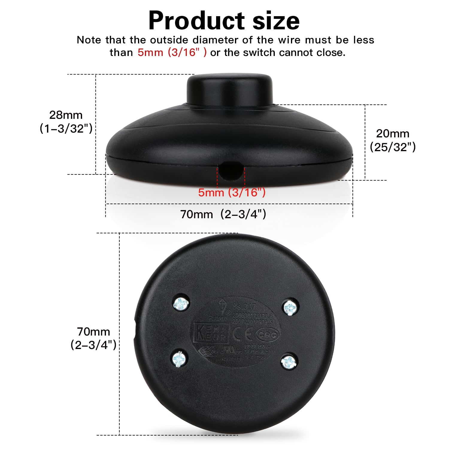 Highest Safety Standards: It have passed UL Listed (E354212), and is ideal for North America electrical safety standards, making you safer to use. Helunsi floor lamp switch is made of high-quality plastic for corrosion resistance and durable. The inside spring loaded pedal buttons can be pressed tens of thousands of times, with long service life. Application: Indoor use only. For DIY, retrofitting, repairing or replacing an old foot switch, the Helunsi foot switch is the ideal money-saving solution. It is suitable for controlling ON/OFF most low-power industrial, office, home appliances and lamps. Such as floor lamp, christmas tree lights, vertical fans, floor fans, pedestal fans, small appliance and more. Specification: Pack of 1. Black color. Overall size: L 2.76 x W 2.76 x H 1.12inch (70x70x30mm); Round base diameter: 2.76inch (70mm); Adaptable cable hole diameter: must be less than 0.2inch (5mm); Voltage and Current: AC 125V/3A or 250V/2A. Please Note Before Purchasing: Please view the fourth picture and pay attention to the type of wire you need to install. Note that solid wire can be easily threaded into the switch and locked in place by the spring plate, stranded wire may require soldering to make them more rigid in order to thread smoothly into the switch. Easy to Use: Instructions included in the package or check the fifth picture for detailed installation steps. 1. When installing, please cut off the power first; 2. Peeling off the live wire insulation; 3. The switch has an automatic wire lock function; 4. Push the wire into the switch interface firmly, and the wire will be clamped automatically. 5. Finally, tighten the cap to complete the installation! Name: Helunsi Floor Lamp Foot Switch The product comes with detailed step-by-step instructions for installation. Foot switch requires to do the installation by yourself. After installing the foot switch on the electrical wires you need, you can control the power on and off by pressing it with your foot or hand. Wide Application Good for an old, broken switch replacement or adding a switch to a light or appliance that was not previously switch available, which can be installed on any wire and widely suitable for DIY table lamps, floor lamps, mirror lamps, wall lamps, small appliances and other electrical products. Specification: Color: Black Quantity: Pack of 1 Overall Size: L 2.76 x W 2.76 x H 1.12inch Metric Units: L 70 x W 70 x H 30mm Measures: 70mm/2.76in Voltage and Current: AC 125V/3A or 250V/2A Switch Material: PC plastic Listed: UL, CE, ENEC, CQC, KEMA KEUR. Adaptable Cable Hole Diameter: Must be less than 0.2inch (5mm) NOTE: Turn off the power before installation. Prevents electric shock! If you don't know how to install after reviewing the instructions, please have a professional electrician assist with the installation! Satisfaction Service If you are not satisfied with your purchase or have installation problems, please contact us by email, we will provide you with a proper solution within 24 hours. We offer 30 days refund/return guarantee and one year warranty, If you receive any damaged or missing product, please contact us for a free replacement.