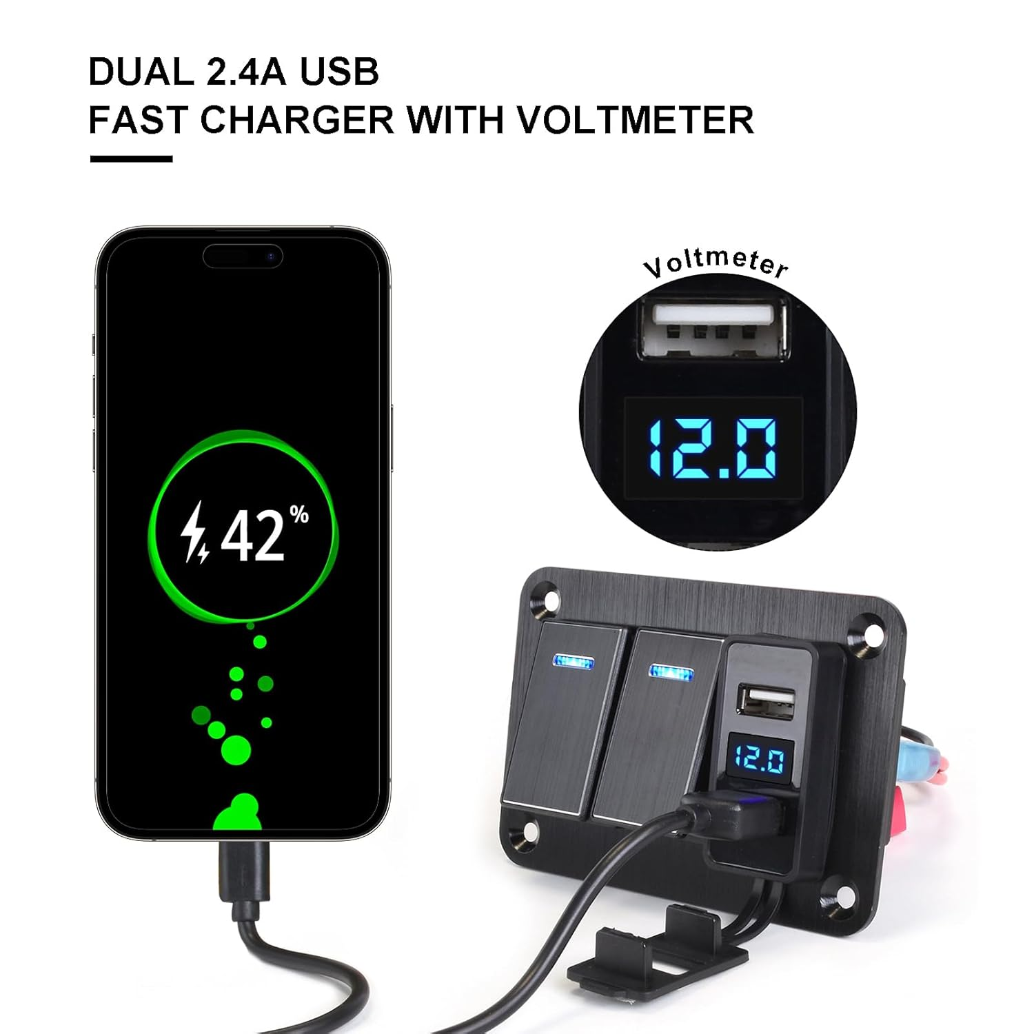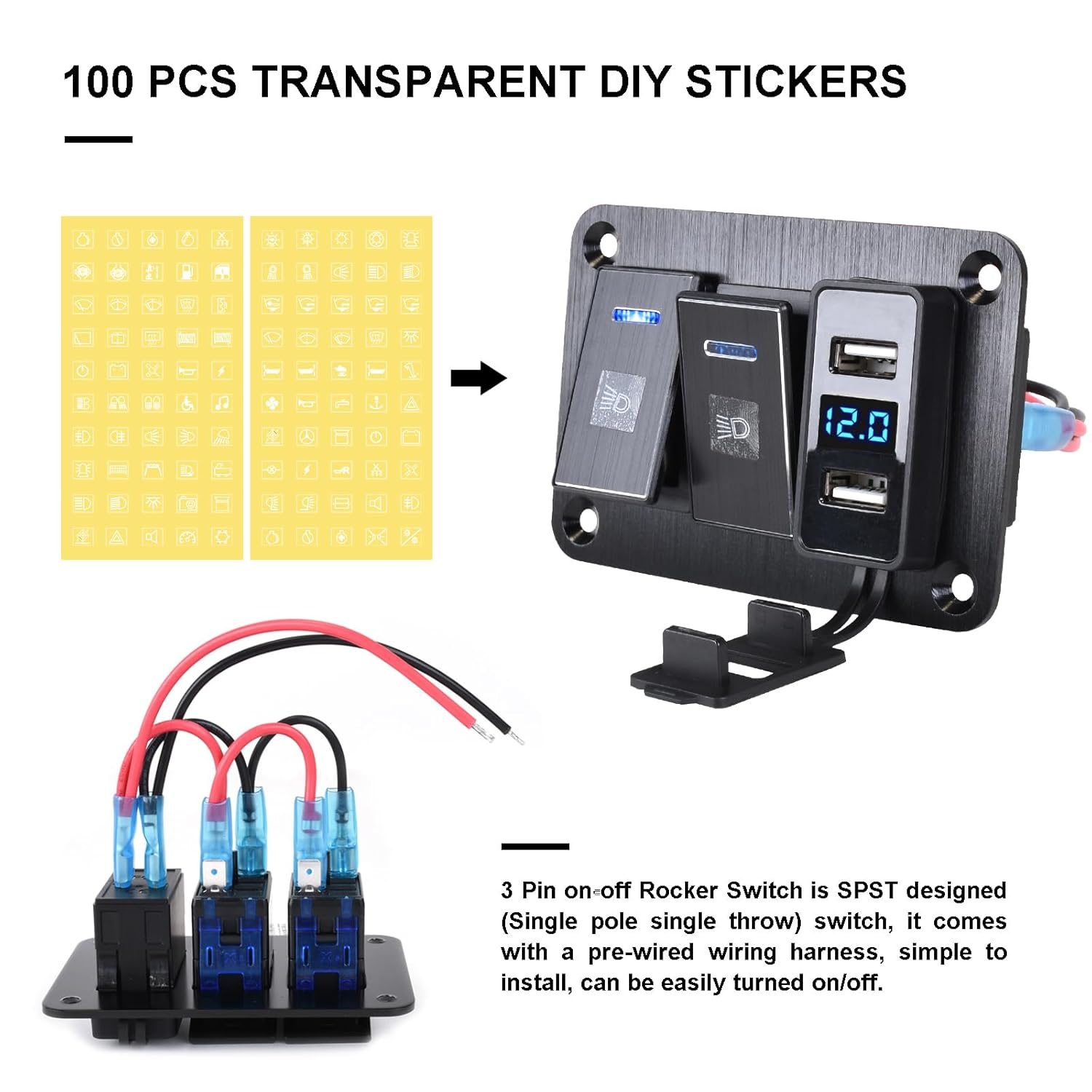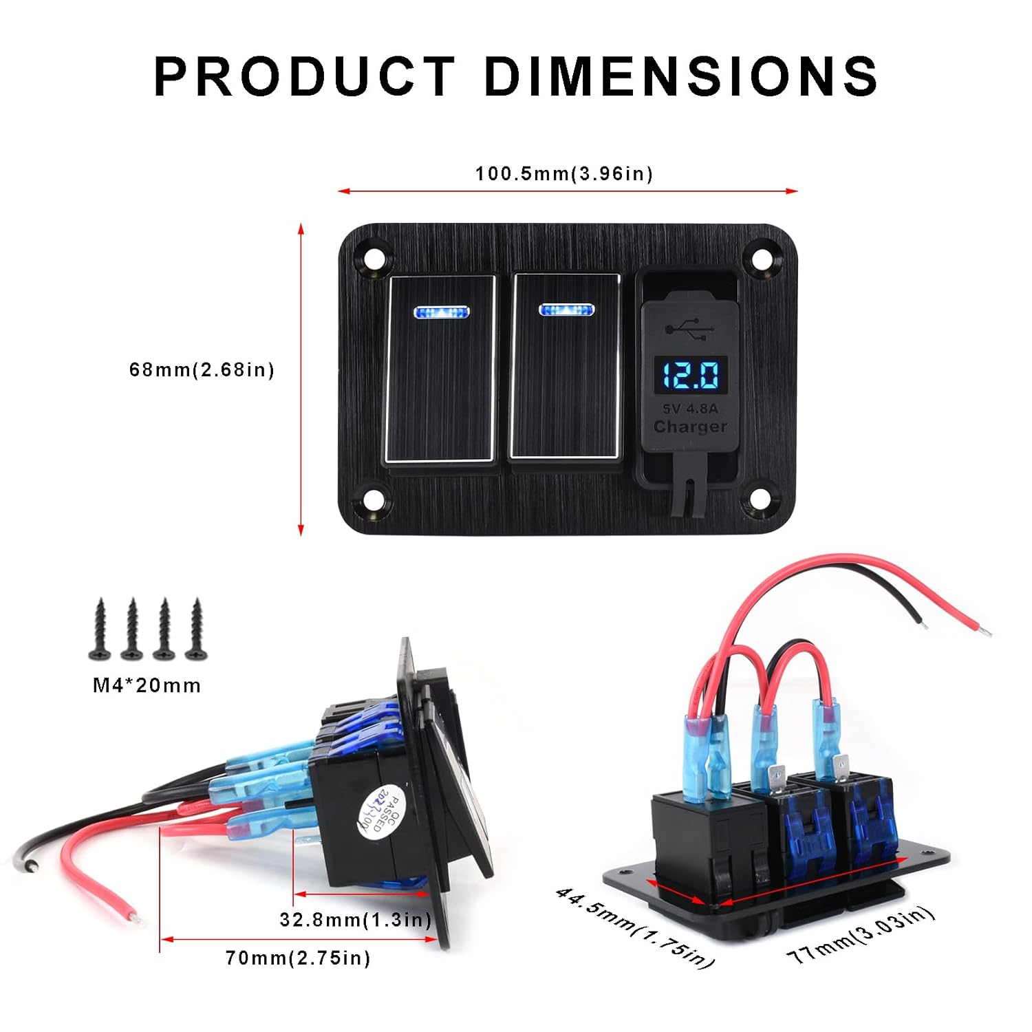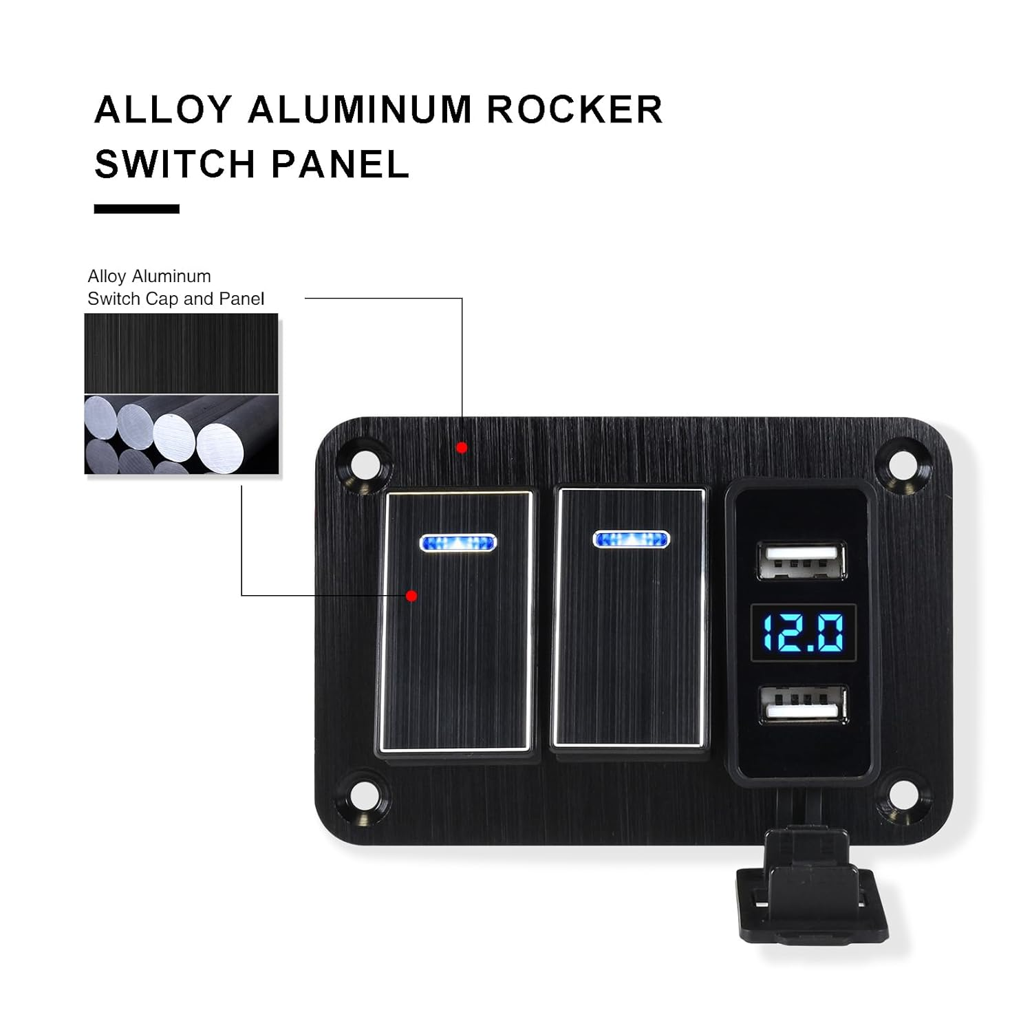 Store New Arrivals Add to Favorite View Feedback Contact 2 Gang Aluminum Rocker Switch Panel with 4.8 Amp Dual USB Charger Voltmeter Waterproof 12V 24V DC Rocker Switch with Night Glow Stickers for Cars Trucks Boats Rvs Description Item model number 6721c9c8-0857-42e1-b26f-3783de39f40f Item dimensions L x W x H 3.96 x 2.68 x 2.75 inches Current Rating 20 Amps Operating Voltage 24 Volts Product Dimensions 3.96 x 2.68 x 2.75 inches; 5.61 ounces Country of Origin China Connector Type Plug In Style 2 Gang Black Terminal Pin Contact Type Normally Open Operation Mode ON-OFF Actuator Type Rocker Circuit Type 2-way Mounting Type Panel Mount Specification Met CE, FCC, RoHS Switch Type Rocker Material Aluminum,Plastic,Silicone ★[Easy to install]: This 3-pin on-off rocker switch features a Single Pole Single Throw design, allowing for simple installation and the ability to easily turn your light on or off. The rocker switch panel can be applied to DC12V/24V operating voltage. ★[Waterproof Aluminum Switch Panel]: Our waterproof aluminum switch panel features durable waterproof switches and an aluminum panel that is sturdier and more durable than plastic. Its unique waterproof technology includes an ultra-thin silicone film that prevents water from entering the switch panel's interior, ensuring the cavity remains dry. This technology minimizes the risk of short circuits, making the boat rocker switches safer to use. ★[Premium LED & DIY Sticker]: The rocker switch features a red LED light that illuminates, making it easy to find the switch in the dark. Additionally, the switch is customizable to fit your specific usage needs with the included DIY sticker, providing a superior user experience. ★[Buckles Design]: Each toggle switch features buckles on both sides, made of high-quality polycarbonate materials. These buckles secure the toggle switches more tightly onto the panel, preventing them from falling off or malfunctioning during use. ★[Wide Application]: This switch panel features a pre-wired design for controlling various LED lights and equipment. It can be used universally for all types of vehicles such as cars, RVs, motorcycles, buses, marine boats, trailers, and jeeps. One added convenience is the switch with a USB charging port. Product Description Package comes with DIY stickers. There are various patterns which meet your DIY needs. About Us Xhtechnology has been devoted to developing and supplying professional automotive, RV, marine modification switch and circuit protection equipment for many years. The range of product covers rocker switch panels, smart touch control panels and many other accessories. Your satisfaction is our eternal pursuit. Hope our products can bring you more happiness sense. 2 Gang On/Off Rocker Switch Panel+USB Style: On-Off+USB Installation: pre-wired Light color: Blue Material: Aluminum Cutout size: 3.03*1.75 in Panel size: 3.96*2.68 in ABOUT US We offer the best prices around on high quality products. Our E-store includes media such as books, movies, music and games while offering electronics, toys, sporting apparel, clothing, tools, general home, garden items and more. SHIPPING We are always working hard to ensure your package arrives as soon as possible. Please understand that some factors like weather, high postal traffic, and the performance of shipping companies are outside of our control. We offer free shipping to the lower 48 states and ship within 2 business days of payment, usually sooner. We do not accept P.O. Boxes. Please provide a physical address. For shipping outside of the continental USA, we only use eBay's Global Shipping Program.The item is shipped to KY and then sent to the rest of the world. International customers are responsible for all duties and taxes. Continue to check out in order to calculate costs for shipping the item to your country. Messages regarding eBay's Global Shipping Program MUST be directed at eBay EXCLUSIVELY. RETURNS We offer a 30-Day Return Policy on items which you are not completely satisfied with. You have the option for a full-refund or an exchange of the item. No returns are available on items shipped outside of the USA. PAYMENT We accept PayPal. CONTACT US This page content is yet to come Please ad us to your favorite seller and visit again later Thank You CUSTOMER SATISFACTION We try our very best to make sure every customer is completely satisfied. If there's a problem, message us! We're happy to help. WE ACCEPT Copyright © 2021 AutoDS. | All Rights Reserved