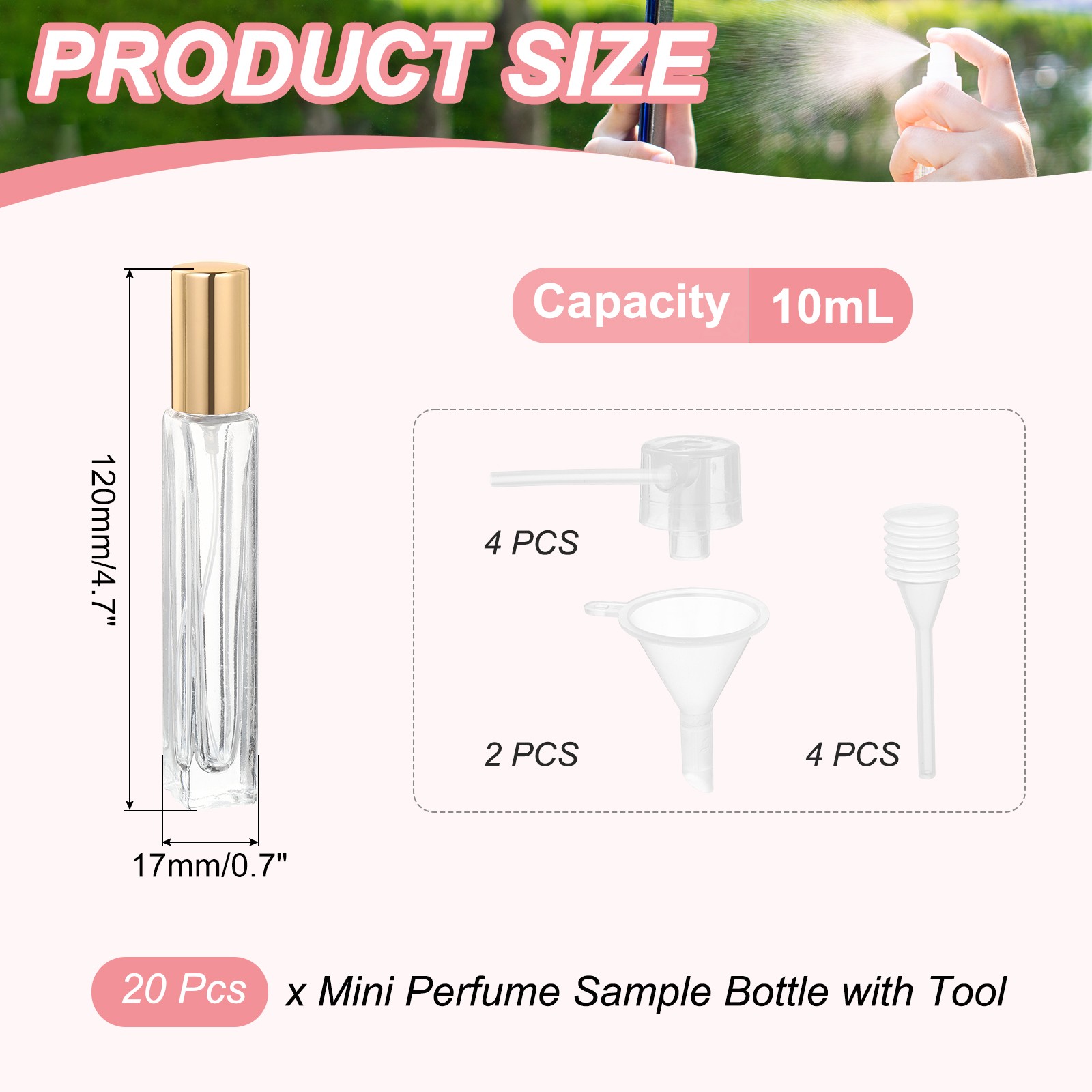 Document Description:Material: The travel bottles are made of durable and refillable Glass and PP material, which is not easily broken and deformed and can be reused after washing.Leakproof Design: The aluminized nozzle and spring button make it convenient for you to use, providing even lotion at every press. The screw cap features a screw-on design for easy pouring out and leak-proof performance.How to Refill: Twist off the cap, pour the liquid into the bottle, and close the cap, making it easy to refill the perfume bottles with your preferred fragrance. Then Press the pump to squeeze out the solution.Wide Application: The mini perfume sample bottle can be used for travel, bathroom, kitchen, and business trips. It is suitable for dispensing essential oils, body mist, perfumes, etc.SpecificationMaterial: Glass and PPColor: Clear/GoldCapacity: 3mlOverall Size: 56 x 17 mm/ 2.2 x 1 Inch(H*OD)Packing Content: 25 Pcs x Mini Perfume Sample Bottle with ToolColor: Clear/GoldCapacity: 10mlOverall Size: 120 x 17 mm/4.7 x 0.7 inches(H*OD)Packing Content: 20 Pcs x Mini Perfume Sample Bottle with Tool 20 Pcs 10ml Fine Mist Bottles Refillable Empty Mini Spray Bottles (Clear/Gold) Description: Material: The travel bottles are made of durable and refillable Glass and PP material, which is not easily broken and deformed and can be reused after washing. Leakproof Design: The aluminized nozzle and spring button make it convenient for you to use, providing even lotion at every press. The screw cap features a screw-on design for easy pouring out and leak-proof performance. How to Refill: Twist off the cap, pour the liquid into the bottle, and close the cap, making it easy to refill the perfume bottles with your preferred fragrance. Then Press the pump to squeeze out the solution. Wide Application: The mini perfume sample bottle can be used for travel, bathroom, kitchen, and business trips. It is suitable for dispensing essential oils, body mist, perfumes, etc. Specification Material: Glass and PP Color: Clear/Gold Capacity: 3ml Overall Size: 56 x 17 mm/ 2.2 x 1 Inch(H*OD) Packing Content: 25 Pcs x Mini Perfume Sample Bottle with Tool Color: Clear/Gold Capacity: 10ml Overall Size: 120 x 17 mm/4.7 x 0.7 inches(H*OD) Packing Content: 20 Pcs x Mini Perfume Sample Bottle with Tool Hot Item Payment 1.We accept eBay payment . 2.Payment must be received within 7 business days of auction closing. Shipping 1.We ship to your eBay or Paypal address. Please make sure your eBay and Paypal address is correct before you pay. 2.Items will be shipped within 1-3 business day when we received payment. 3.Delivery time depends on destination and other factors. Description Policy 20 Pcs 10ml Fine Mist Bottles Refillable Empty Mini Spray Bottles (Clear/Gold) Description: Material: The travel bottles are made of durable and refillable Glass and PP material, which is not easily broken and deformed and can be reused after washing. Leakproof Design: The aluminized nozzle and spring button make it convenient for you to use, providing even lotion at every press. The screw cap features a screw-on design for easy pouring out and leak-proof performance. How to Refill: Twist off the cap, pour the liquid into the bottle, and close the cap, making it easy to refill the perfume bottles with your preferred fragrance. Then Press the pump to squeeze out the solution. Wide Application: The mini perfume sample bottle can be used for travel, bathroom, kitchen, and business trips. It is suitable for dispensing essential oils, body mist, perfumes, etc. Specification Material: Glass and PP Color: Clear/Gold Capacity: 3ml Overall Size: 56 x 17 mm/ 2.2 x 1 Inch(H*OD) Packing Content: 25 Pcs x Mini Perfume Sample Bottle with Tool Color: Clear/Gold Capacity: 10ml Overall Size: 120 x 17 mm/4.7 x 0.7 inches(H*OD) Packing Content: 20 Pcs x Mini Perfume Sample Bottle with Tool Hot Item Payment 1.We accept eBay payment . 2.Payment must be received within 7 business days of auction closing. Shipping 1.We ship to your eBay or Paypal address. Please make sure your eBay and Paypal address is correct before you pay. 2.Items will be shipped within 1-3 business day when we received payment. 3.Delivery time depends on destination and other factors.