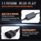 Note: 1. This kit is for vehicles with Factory Halogen Systems, it will not work with vehicles with Factory HID.Pls confirm the item if it can matches your car before you purchase. 2. If there is an error on the onboard computer after installed LED light bulb on a car, please install a resistor or capacitor to eliminate the error message. This product does not come with an external resistor or capacitor. Specifications Bulb Size: High Beam 9005 + Low Beam H11 + Fog Lights 5202 Usage: Headlights + Fog Lights Package includes: 6 Bulbs Voltage: DC 9-16V Light Power: 60W/set (30W/bulb) Luminous Flux: 6,000LM/set (3,000LM/bulb) Color Temperature: Bright White 6,000K Lifespan: Over 50,000 hours Certification: IP67 Water and Dust Seal, CE, RoHS NOTE: These LED bulbs CAN'T fit if your vehicle has factory LEDs. Feature • 360 Degrees Adjustable Socket for Adjusting The Beam Pattern The mounting collar is adjustable for freely rotate. Free to adjust the socket until it shines the perfect beam pattern. • Amplified Flux Beam|300% Brighter than Halogen The aluminum parts are much thinner than the common ones in the market perform with no dark spot, designed much closer to the factory halogen bulbs and provides 4 times as much light as than stock and excellent night time drivability by taking an amplified flux beam with 6 pieces flip chips on each bulb. • Shorter Size|Quick Installation Without Struggling Built with a smaller/ shorter size than the common LEDs in the market without building an external driver, directly plug into the factory housing. The same design with the OEM halogen bulbs for easy installation. • New Cooling System|Better Heat Dissipation, Last Longer New cooling system with a unique dual ball-bearing fan preventing the driving from the loud noise from the cooling fan, the all-in-one compact aluminum design brings better heat dissipation than common plastic design, and intelligent IC make sure the LED conversion kits last longer.