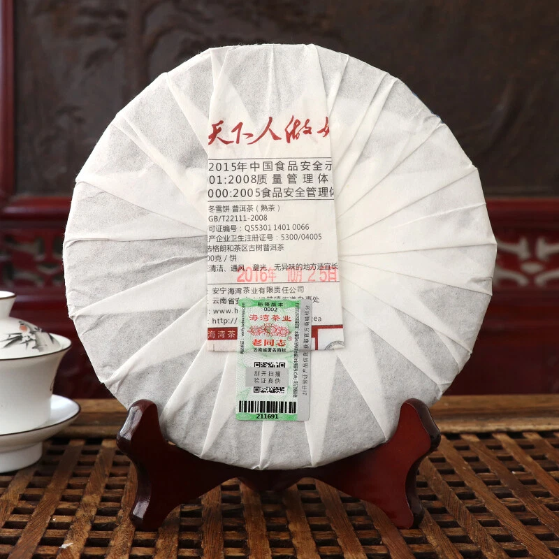 Product detail: Product name: Haiwan Dong Xue puer cake Puer type: Ripe puer tea Production date: 2016 year Net weight: 400g/Pcs Origin: Yunnan, China Storage: Clean, airy, dry, avoid direct sunlight, no pollution, no srange smell Manufacturer: Anning Haiwan Tea Industry Co.,Ltd. Tea Material: Shaiqinmao tea leaves of Yunnan big leaves species ( Without any additive), Gelanghe Ancient tree Puer Tea.
